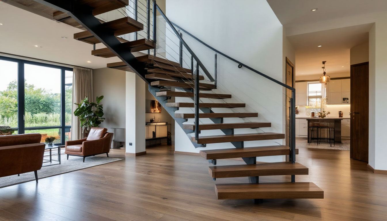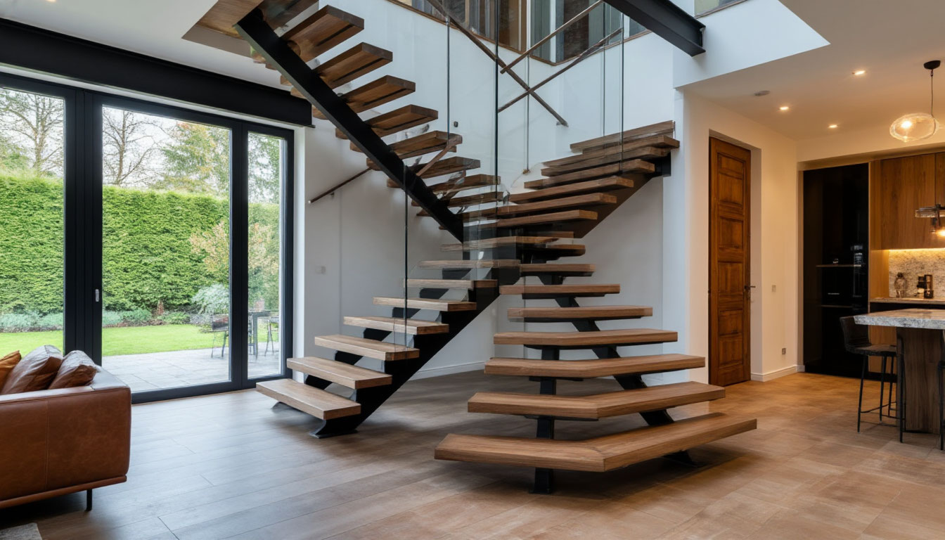 Основой конструкции служит цельная стальная балка, изготовленная методом лазерной резки или гибки. Толщина металла обычно варьируется от 8 до 12 мм, что обеспечивает достаточную жёсткость даже при пролётах более 4 метров. Ступени могут выполняться из дерева, стекла, композитных материалов или металла — выбор зависит от стилевого решения и нагрузок.