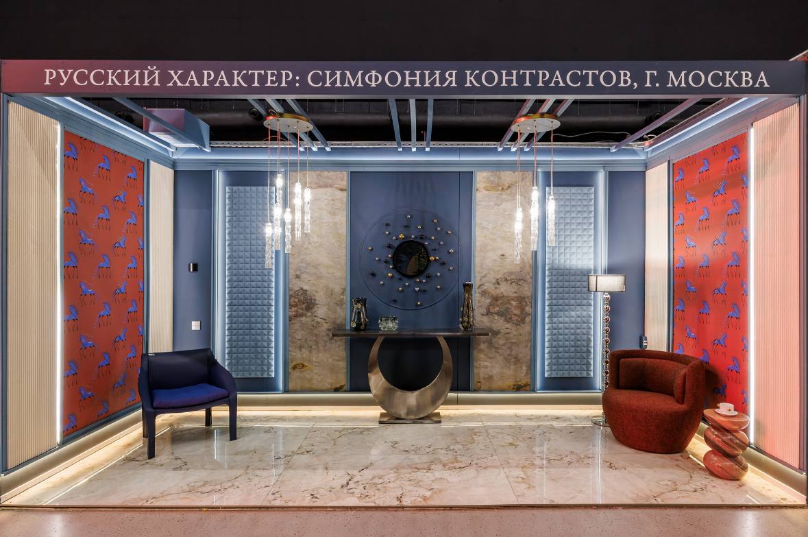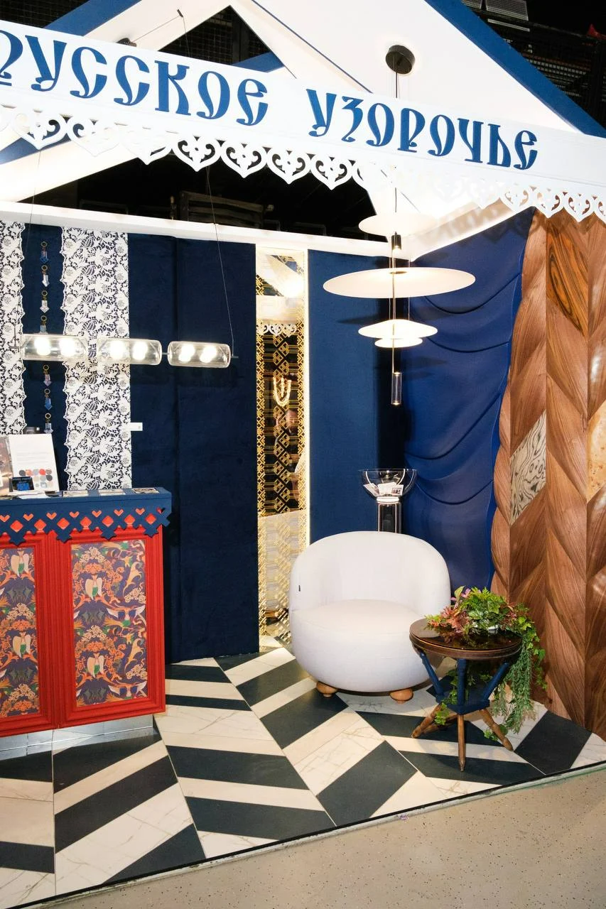 Капсула «Русское узорочье» выполнена в виде гостиничного холла с ресепшеном. Здесь дизайнеры обращались к мотивам XVII века — эпохи многоплановых композиций и декоративного богатства. В интерьере эта многослойность прочитывалась в сочетании фактур и материалов, создающих ощущение глубины и цельности.