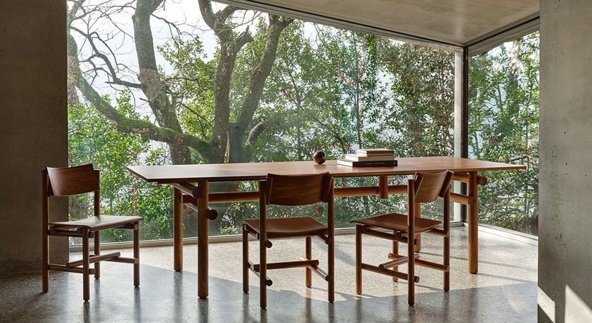 Монолитная мебель для столовой воспевает традиции модернизма, не отменяя практической составляющей.
