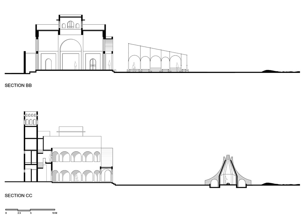 Молитвенный зал, как общественное место для собраний, требовал открытой и гостеприимной атмосферы, в то время как внутренний двор при гостинице должен был сохранять полуобщественный характер, создавая более интимную и созерцательную обстановку. Масштаб, пропорции и дизайнерская выразительность каждого помещения меняются в ответ на функциональные изменения, создавая разнообразные пространственные выражения.