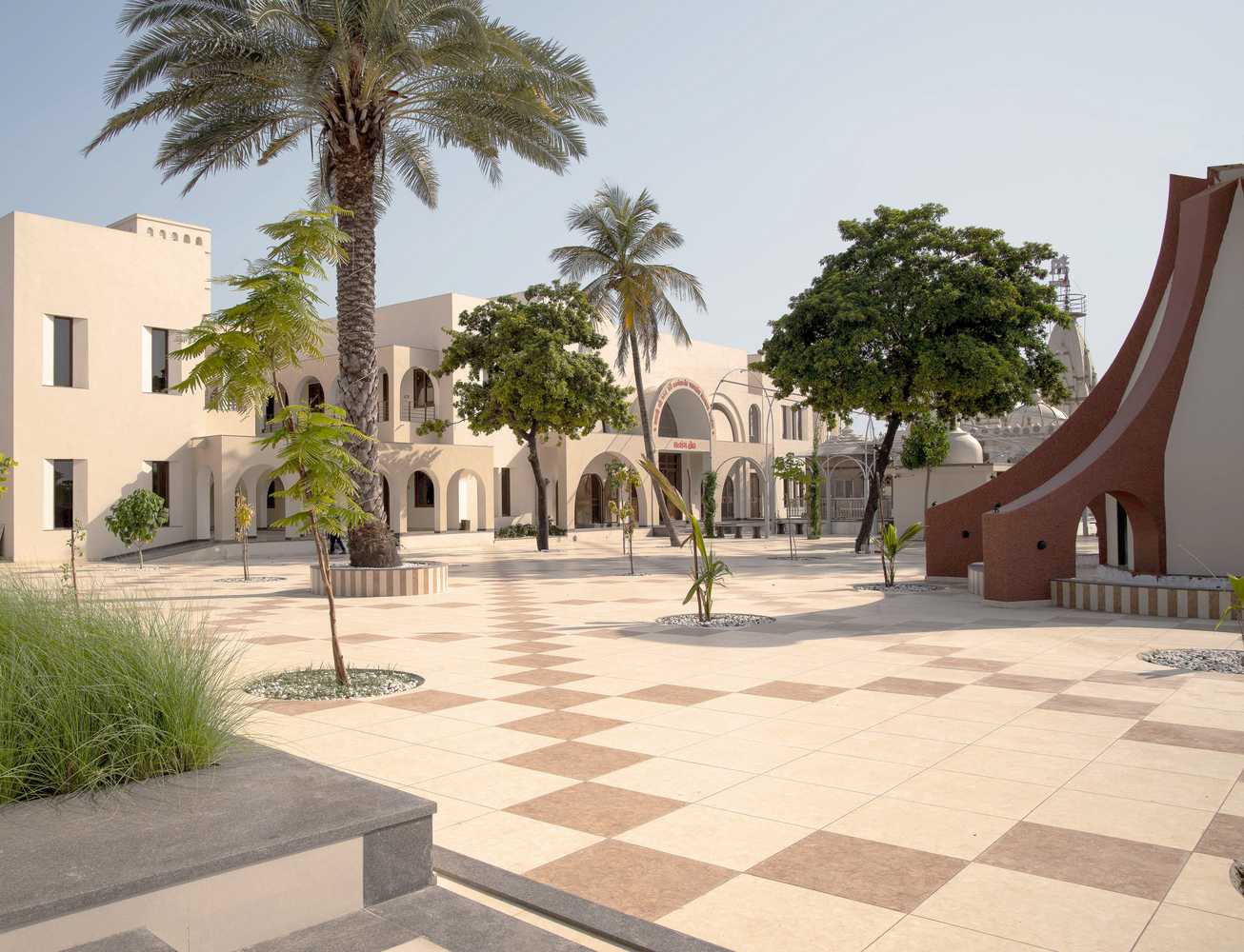Храмовый комплекс в городе Гандинагар имеет глубокие корни в природном и культурном окружении, где архитектура не доминирует, а мягко поддерживает ритмы духовной и общественной жизни. Существующий ландшафт этого места, богатый разнообразными деревьями и птицами, бережно сохраняется, позволяя природе и архитектуре сосуществовать в гармонии. Вместо того чтобы самоутверждаться, искусственная среда выступает в качестве тонкого фона для повседневной жизни и ритуалов сообщества, поощряя общественное взаимодействие и в то же время уважая священный характер этого места.