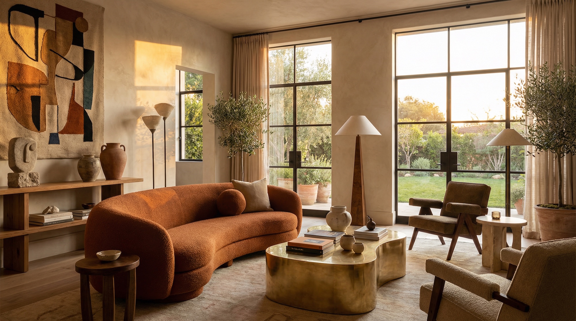 Центр композиции — низкое кресло с глубокой посадкой (например, по типу Togo или Pacha) или напольные подушки дзабутон. Обязателен приставной столик для воды и телефона (который нужно отложить).