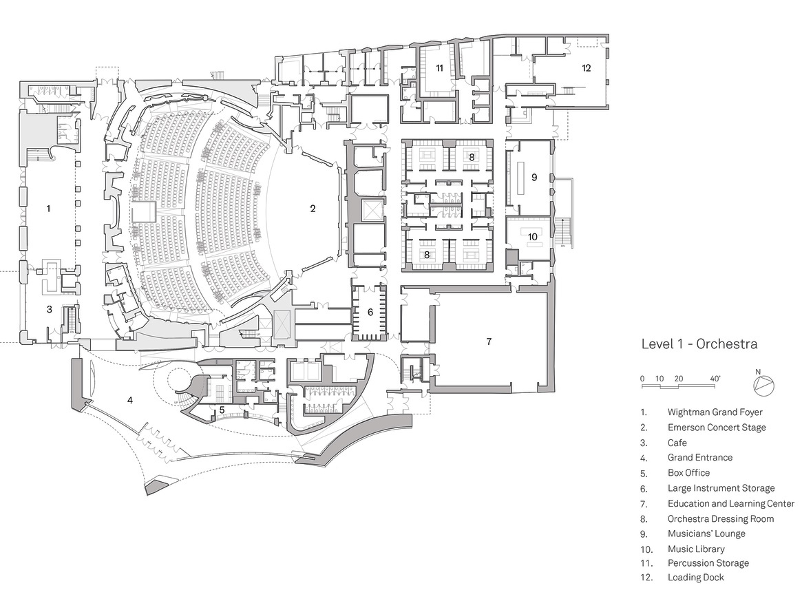 В обновленном концертном зале ряд общественных пространств будет работать в сочетании с расширенным вестибюлем и задней частью здания, чтобы обеспечить всеобщий доступ для публики, а также с образовательными учреждениями и улучшенными помещениями за сценой, которые улучшат все аспекты общественного использования концертного зала.