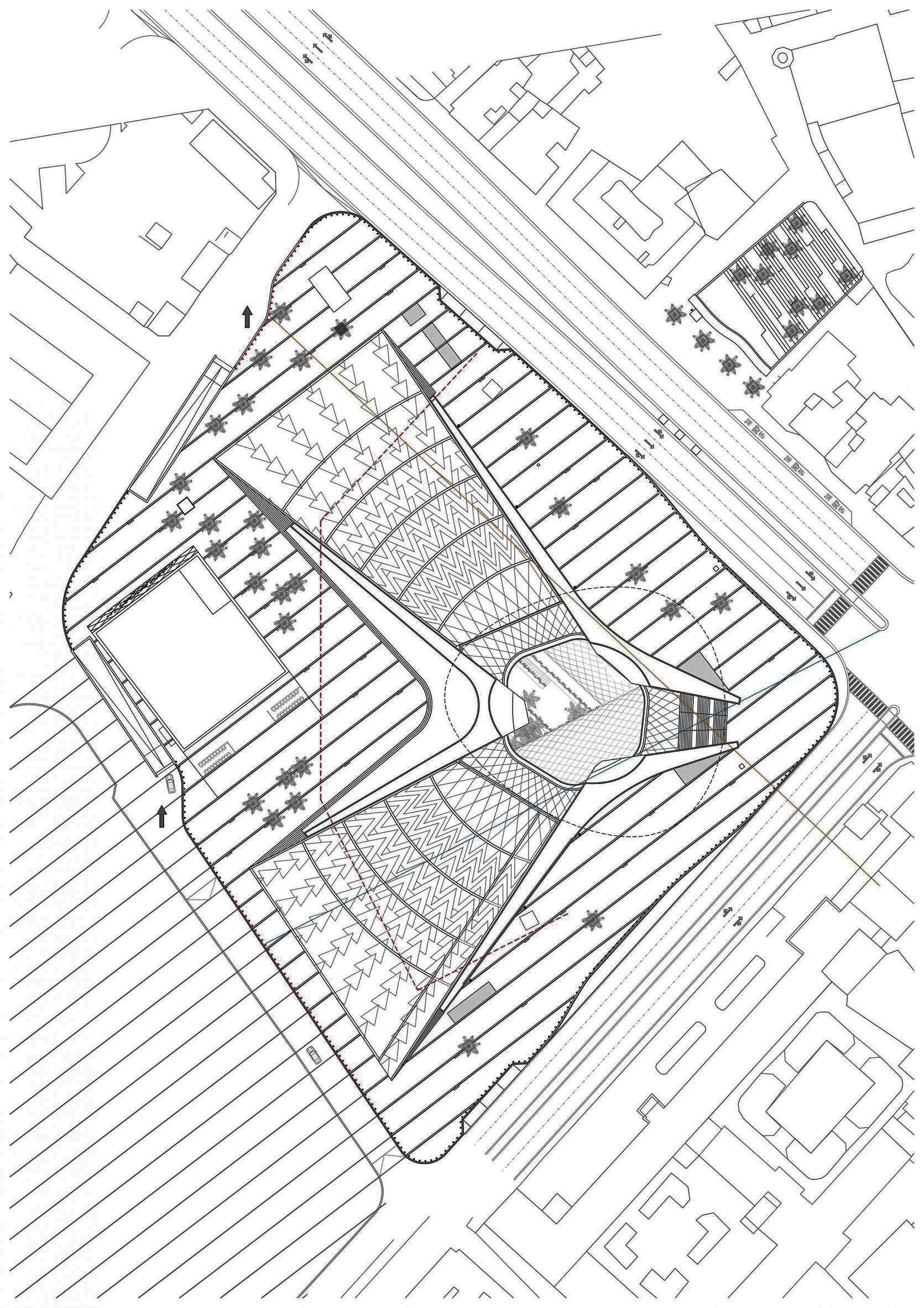 Отличительная черта станции — зеркальный купол в форме чаши, который возвышается над площадью и уходит внутрь, отражая внутреннее пространство здания и его окрестности. Наклонные полы на площади ведут посетителей под навес и на станцию, откуда можно попасть на две линии метро и в подземный сад, окружённый стеной в форме усечённого конуса.