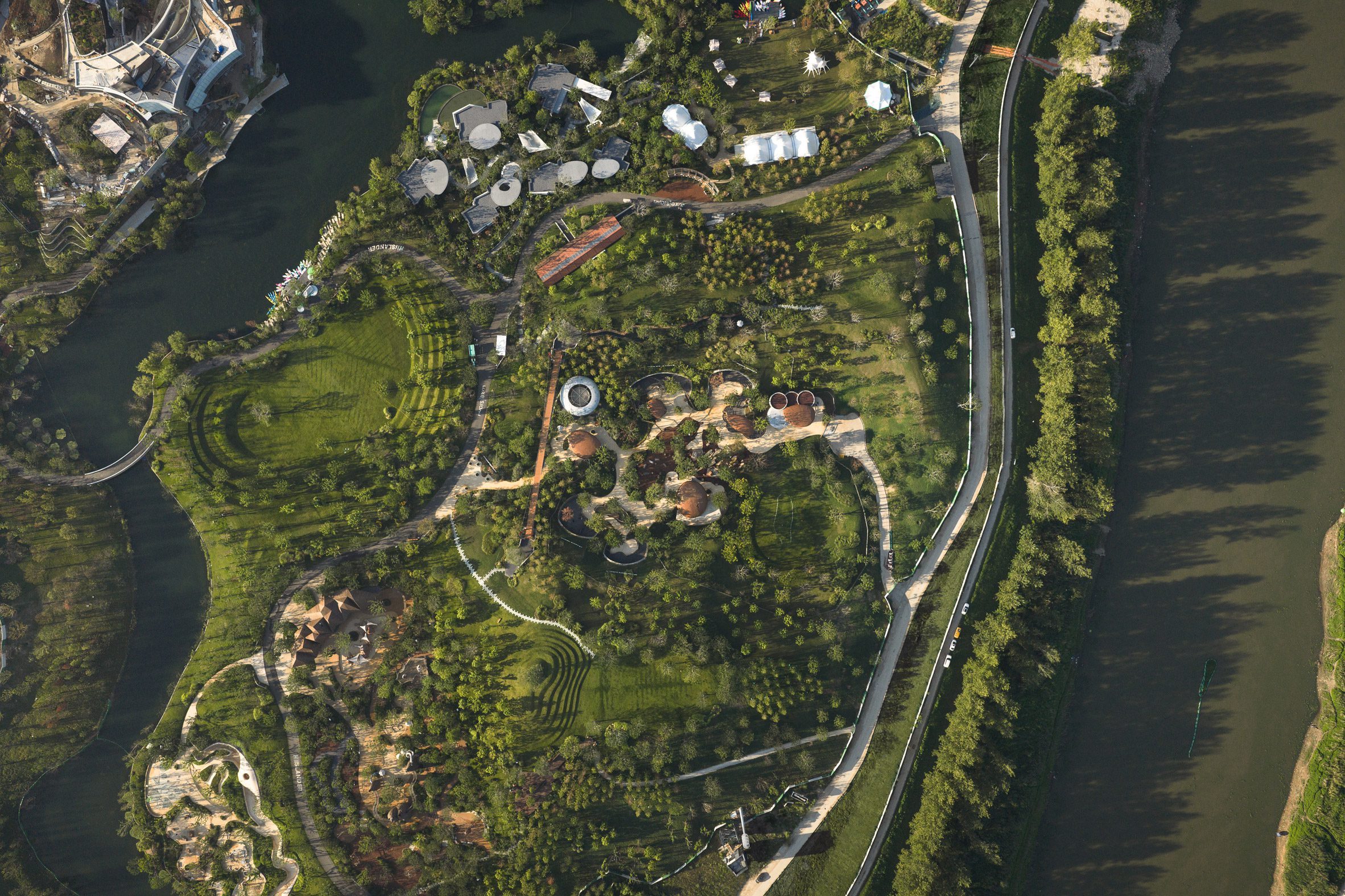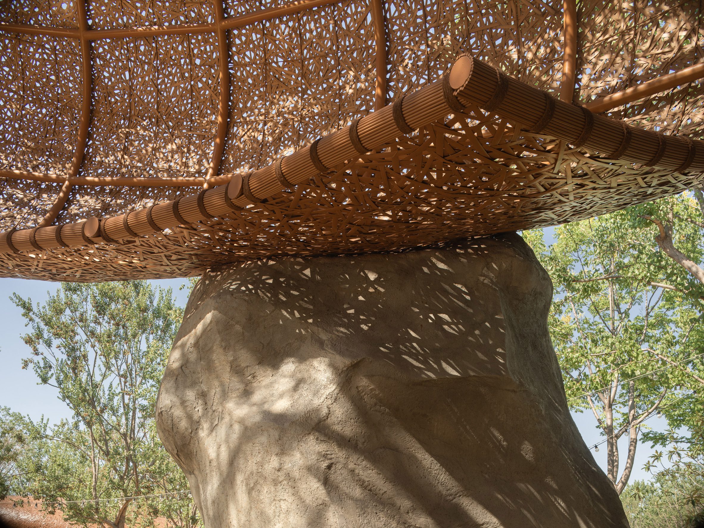 Над крышей каждого из этих зданий возвышается плетёный бамбуковый навес в форме валуна, концы которого разной длины опираются на искусственные стоячие камни. В самом большом навесе над мастерской на ферме были проделаны треугольные отверстия, а нижняя часть валуна была срезана, чтобы придать ему куполообразную форму. Многие открытые площадки должны были быть приспособлены для проведения разнообразных коммерческих и культурных мероприятий, поэтому компания Various Associates предусмотрела зоны для отдыха на тюках сена, каменные валуны и деревянные платформы, которые могут стать импровизированными сценами.