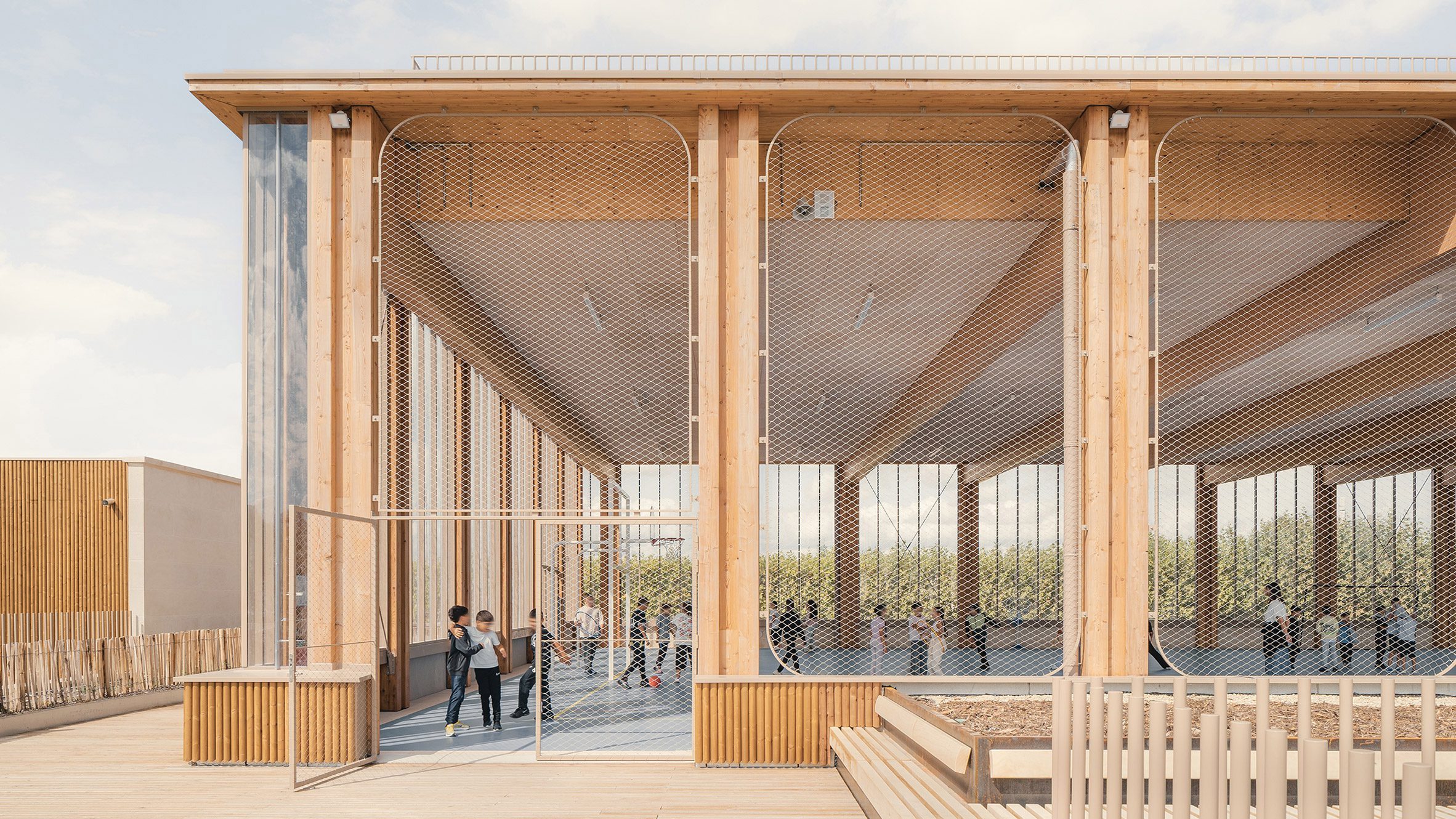 На крыше этой несущей конструкции из камня и дерева школы в Франции расположена спортивная площадка. В школе Groupe Scolaire Simone Veil, расположенной в парижском пригороде Трембле-ан-Франс, на площади 2400 м2 находятся восемь классных комнат, столовая, административные помещения, а также спортивная площадка, которой пользуются местные общественные организации. Архитектурное бюро Le Penhuel & Associés из Парижа использовало для строительства школы палитру биоматериалов, в том числе древесину, местный известняк и глиняный кирпич, что отражает их убеждение в том, что образовательные учреждения должны демонстрировать экологичные методы строительства.
