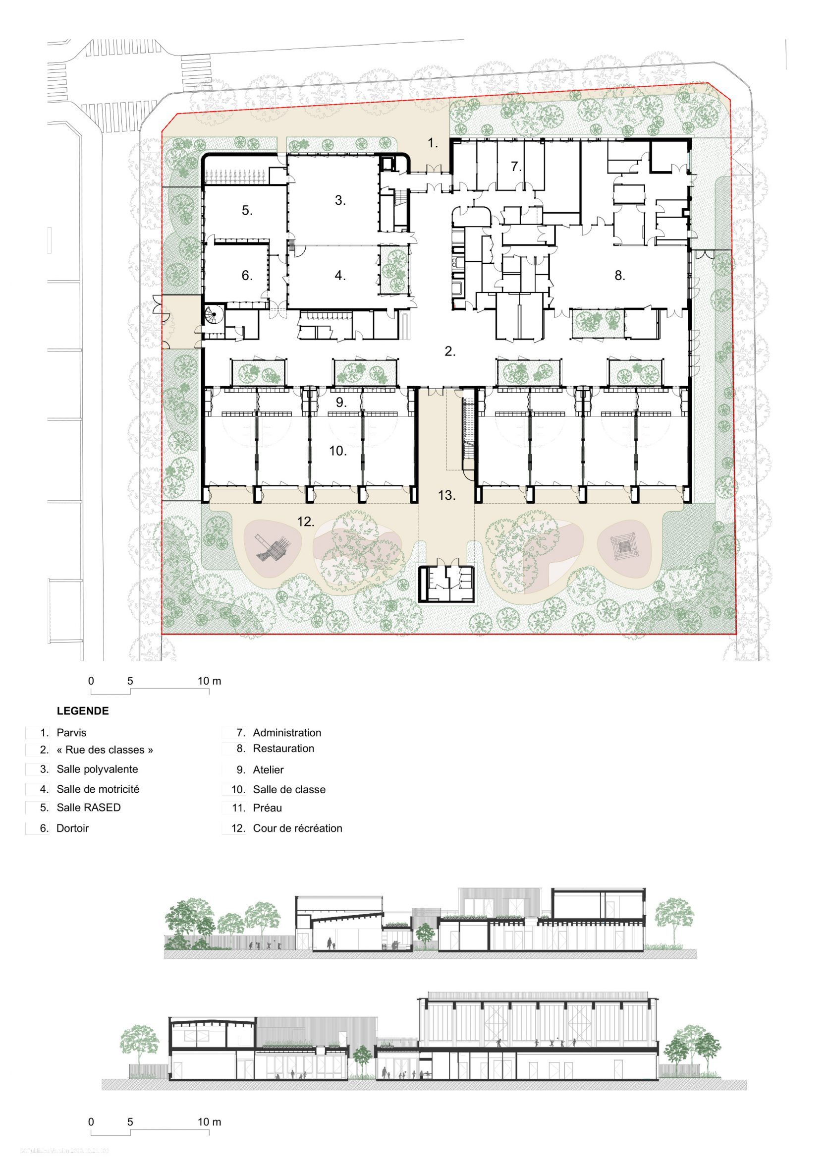 Учитывая меньшие размеры соседних жилых домов, школа Groupe Scolaire Simone Veil занимает преимущественно одноэтажное здание. На небольшом первом этаже расположены спортивная площадка и помещение для школьного смотрителя. В центре школьного здания две оси образуют крест: вытянутый вестибюль с севера на юг и «учебная улица», соединяющая учебные помещения с востока на запад.