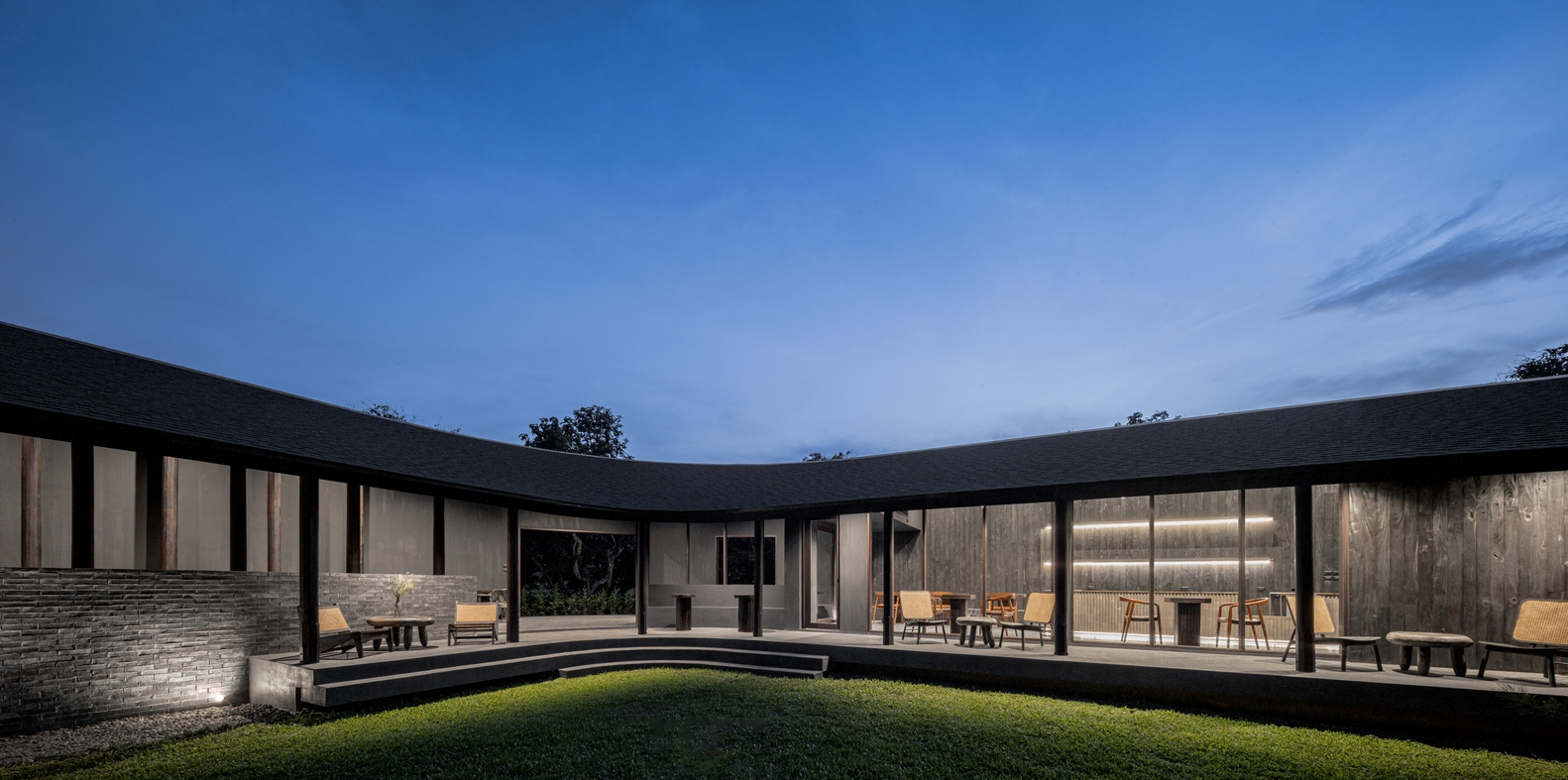 Здание J-образной формы окружает внутренний сад, дополнительно огороженный перевернутым кирпичным забором в форме буквы J, который скрывает внутреннюю деятельность и усиливает ощущение тишины в зоне приёма. На концах обрамлённых обзорных площадок вырисовываются естественные скульптурные формы стволов личи, которые сами по себе напоминают произведения искусства. Архитектура в тёмных тонах мягко настраивает восприятие зрителя, позволяя оценить окружающую зелень с визуальным комфортом.