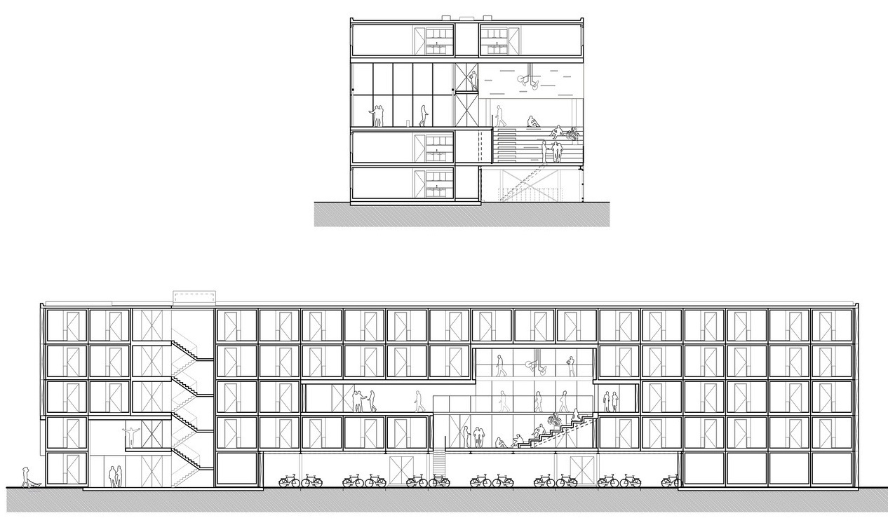 Архитекторы спроектировали "Сердце" как гибкое и привлекательное место, подходящее для всего: от занятий на свежем воздухе до совместных мероприятий. Ступенчатые платформы служат в качестве сидячих мест, террас или неформальных сцен, поощряя спонтанное использование. Наряду с сердцем здания, в нём продуманы общие внутренние функции, способствующие общественной жизни: общая гостиная с кухней и длинным обеденным столом, уютные рабочие уголки, комната отдыха с телевизором и прачечная. Стеклянная стена в полный рост соединяет гостиную с университетским городком.