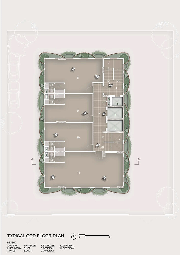 Зелёные перегородки обрамляют фасад, повышая тепловые характеристики и визуальный комфорт. Центр обслуживания и циркуляции расположен на восточном краю, что позволяет открыть северную, западную и южную стороны для офисных помещений с естественным освещением. Более просторные офисы расположены спереди и сзади, благодаря дневному свету, сквозной вентиляции и виду на улицу, что повышает комфорт посетителей.