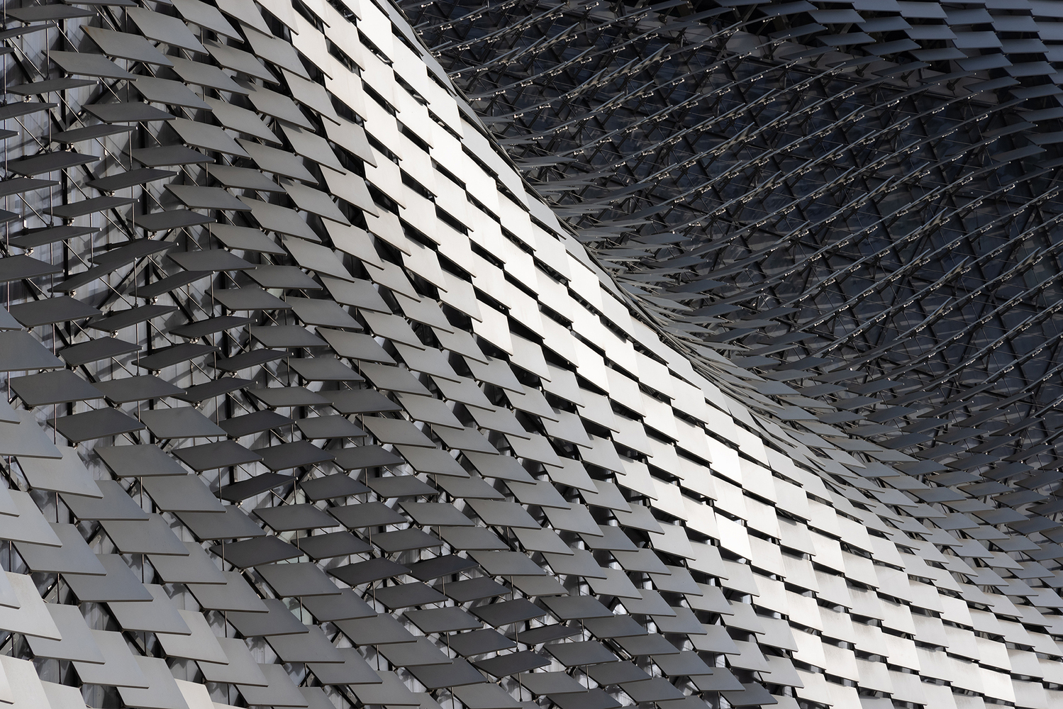 Технологии BIM и 3D-сканирования использовались для достижения точности при проектировании обширных пространств и сложных навесных стен. Двухслойный алюминиевый фасад, сгенерированный параметрически, образует поверхность свободной формы, напоминающую рыбью чешую, в то время как стальной каркас с 80-метровыми ферменными перемычками решает проблемы, связанные с конструкциями на кручение. Полнопроцессный BIM обеспечил высокую степень интегрированности проектирования и эффективность строительства.