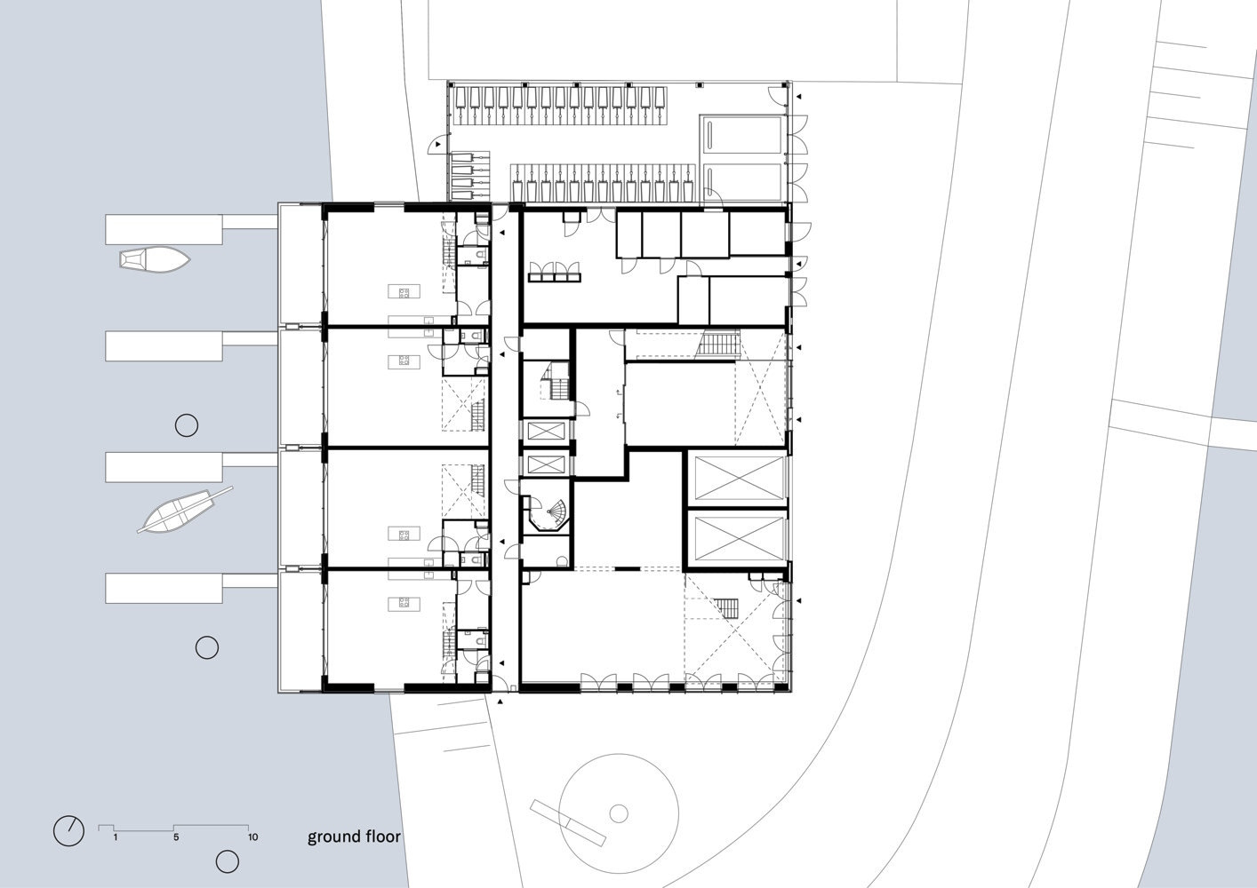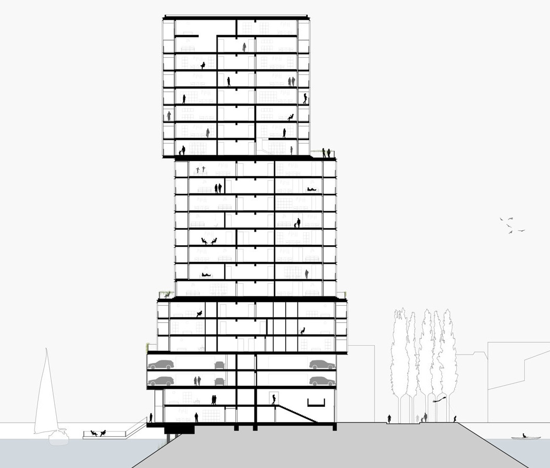 Как и исторические склады, башня опирается на воду, воплощая архитектурный язык складов, фабрик и штабелируемых контейнеров в современной архитектуре. Расположенные в шахматном порядке объёмы возвышаются над набережной, создавая прочный профиль, напоминающий конструкцию промышленного здания. Эта композиция подчёркивает первозданность этого места, в то время как изысканная материализация и обширное остекление привносят новое качество жилья, переосмысливая промышленное наследие как основу для новой идентичности прибрежной зоны.