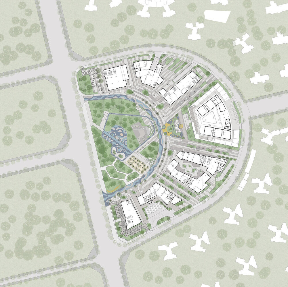 Территория окружена полукруглой муниципальной зелёной зоной. Согласно стратегии проектирования, парк, окружённый четырьмя изолированными зданиями, является пространственным центром. Широкая платформа второго уровня объединяет эти строгие строения в единый ансамбль. Этот простой, но решительный жест кардинально изменил форму и идентичность комплекса. Теперь каждое здание выходит окнами в парк, направляя энергию и активность в центр оживлённого сообщества.