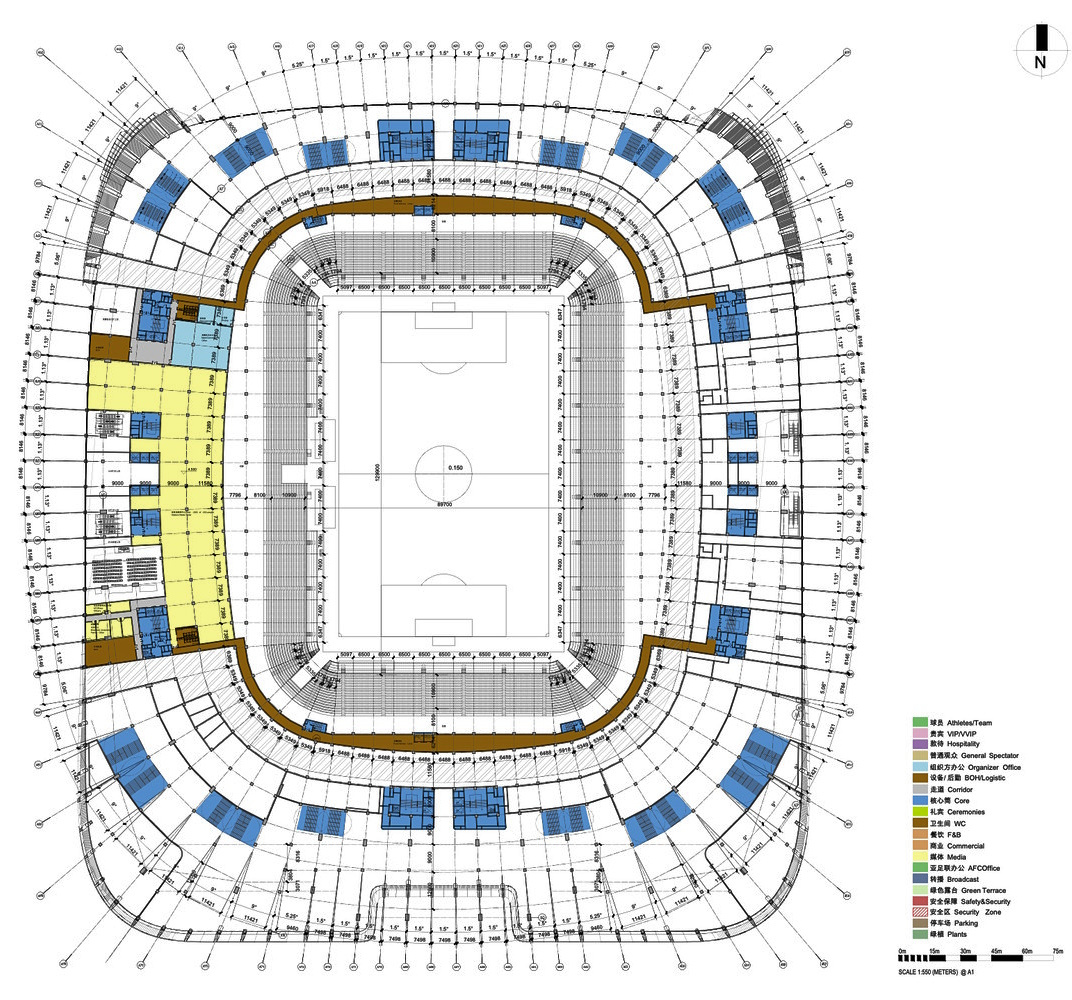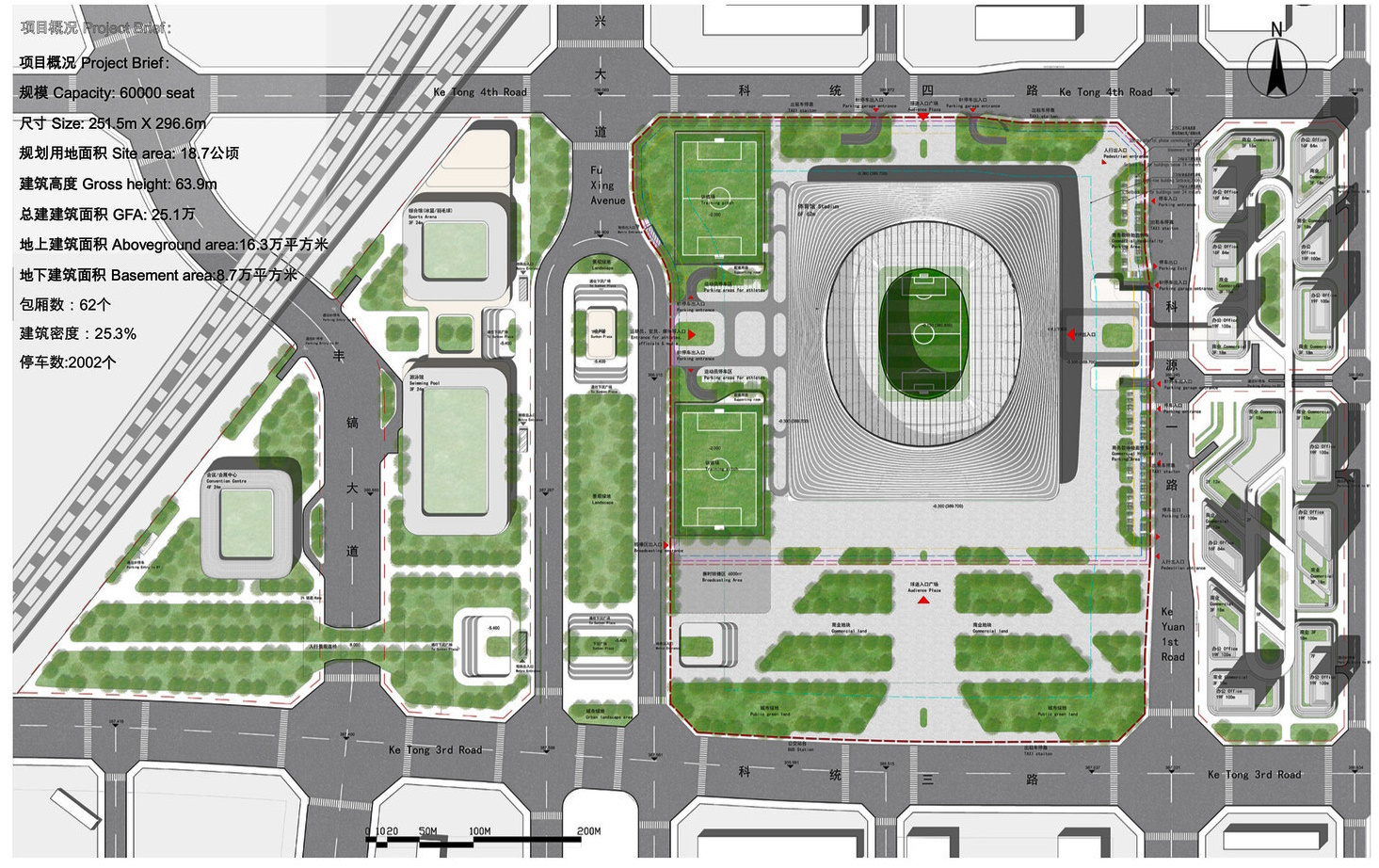 Расположенный в ортогональной городской сетке городского района Фэндун стадион с открытыми фасадами приглашает жителей города в самое сердце здания, чтобы наслаждаться его общественными пространствами, местами отдыха и ресторанами в любое время года. Расположенные на нескольких тенистых террасах, выходящих на южную сторону, с видом на город, эти удобства также служат для зрителей во время футбольных матчей, культурных мероприятий и представлений.