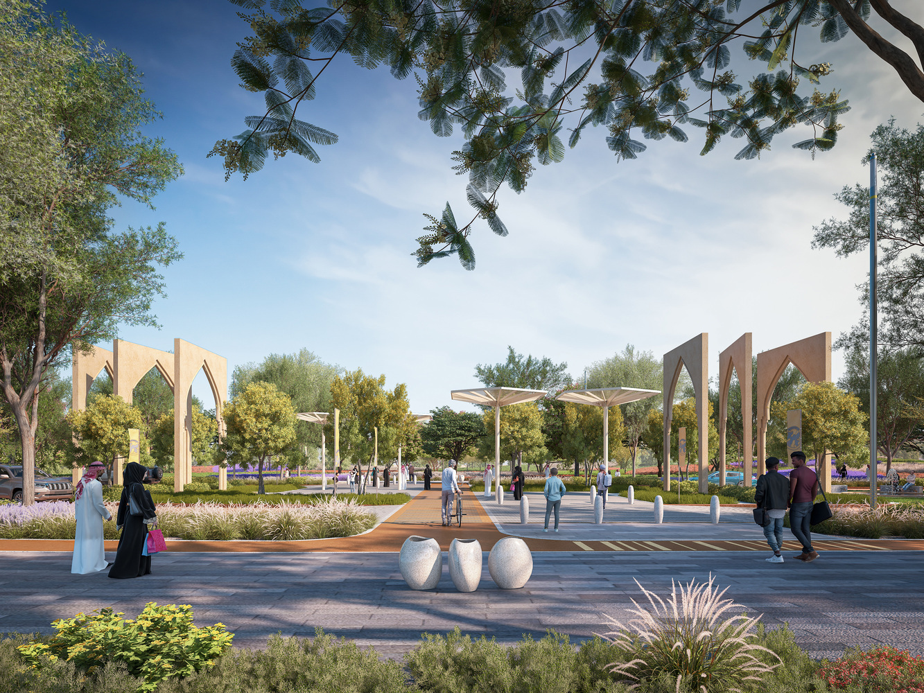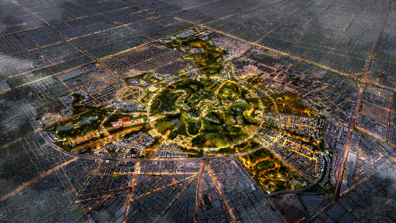 Согласно генеральному плану, парк будет организован вокруг сети разветвлённых долин, вдохновлённых региональными вади (сухих русел рек), которые сходятся в центральной части парка. Эта топографическая стратегия структурирует движение и распределяет по территории парка затенённые пешеходные коридоры, зоны отдыха и места для собраний. На территории планируется высадить около миллиона деревьев, а также внедрить экологические системы, включающие орошение очищенными сточными водами и восстановление почвы для улучшения водоудерживающей способности. Эти меры призваны смягчить последствия засушливого климата Эр-Рияда и представить проект как ландшафтную инициативу, так и инфраструктурный проект.