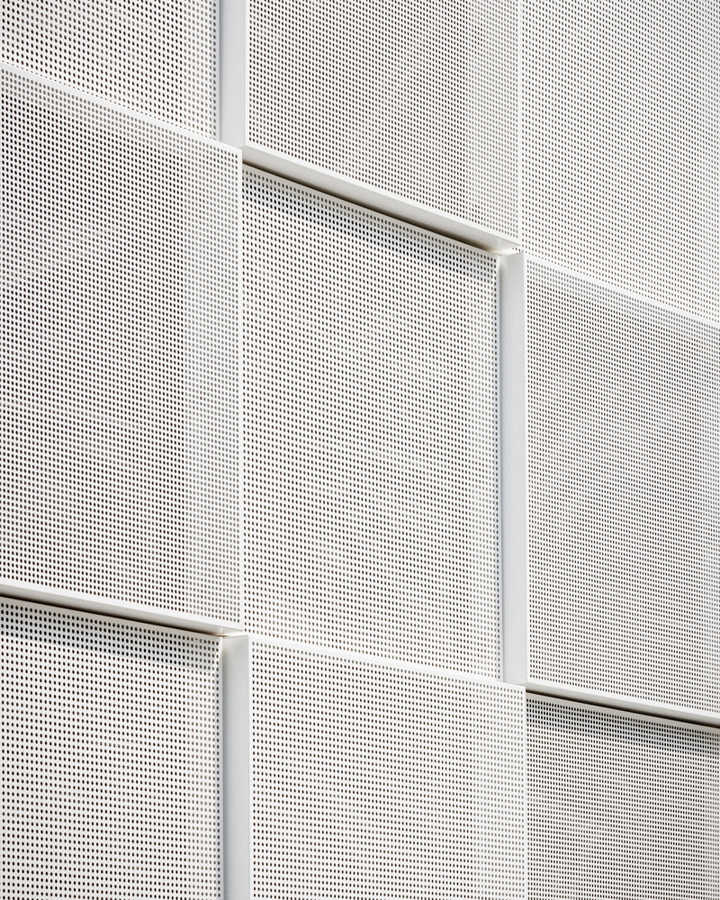 Белая перфорированная металлическая обшивка объединяет старое и новое, контрастируя с оригинальным чёрным фасадом и создавая визуальную гармонию с соседними общежитиями. Решетка размером 1,17 х 1,17 метра трансформируется в треугольные модули на надстройке, создавая динамичный рельеф, меняющийся в течение дня. Стеклопакеты двойной высоты размером 2,34 х 2,34 метра подчеркивают эту металлическую завесу, создавая ритмичный архитектурный язык.