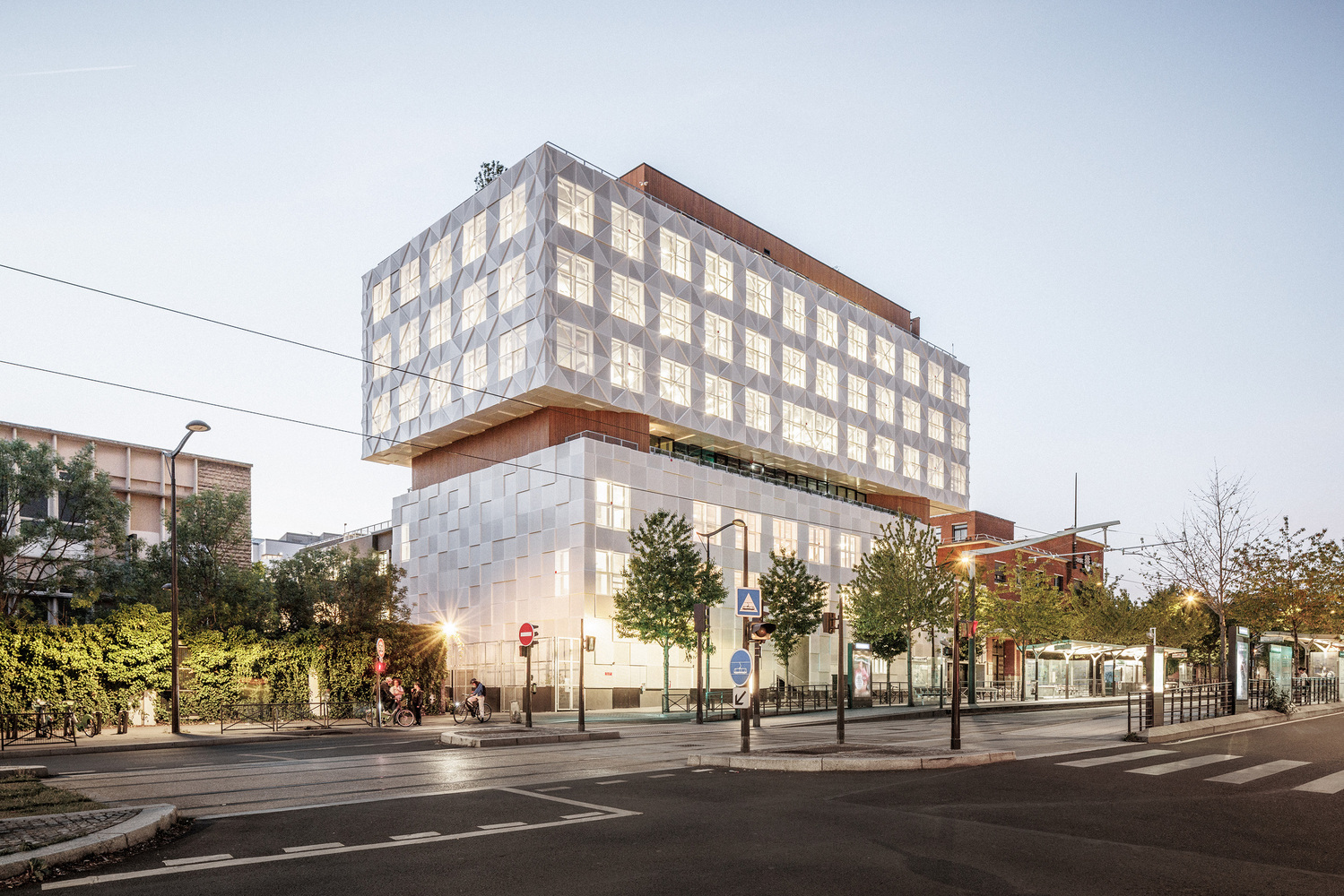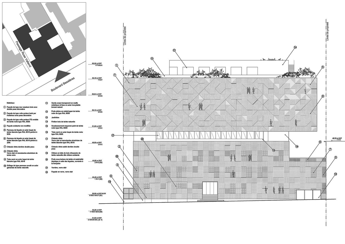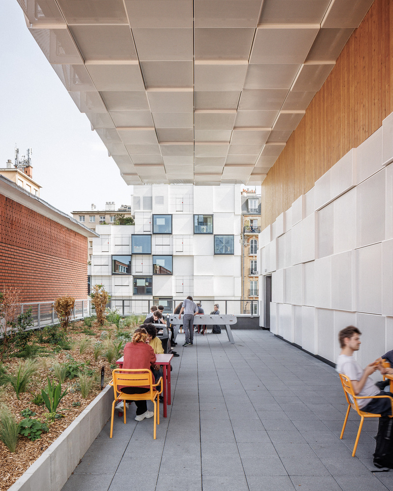 Архитектурная стратегия - опираться на существующее. Вместо того, чтобы начинать с нуля, архитекторы сохранили существующее здание, добавив четыре основных объёма и пятиэтажную металлическую надстройку высотой 18 метров. Такой подход воплощает архитектурную бережливость - достижение большего с меньшими затратами - при уважении истории объекта. Оригинальное сооружение, построенное в 1962 году на земле, расчищенной от разрушенных парижских укреплений, в частности бастиона 42, придаёт символический резонанс цифровому кампусу.
