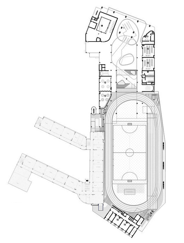 Используя вертикальные манипуляции с рельефом, большие функциональные блоки, такие как спортивный зал и аудитория, встраиваются в фундамент в виде цоколей. Учебные группы "парят" над этим основанием, а каскадные террасы образуют яркие переходные пространства – игривую "долину" для занятий с детьми.