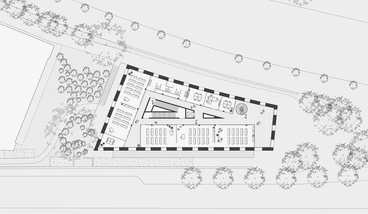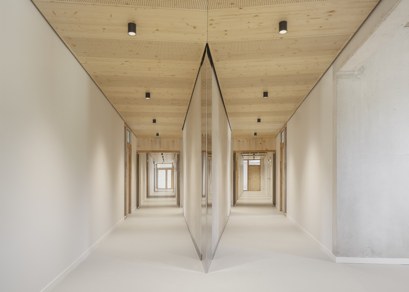 Конструкция из стоек и балок с лёгкими и легко трансформируемыми перегородками обеспечивает адаптивность и обратимость здания, что облегчает интеграцию с меняющимися требованиями и организацией. На первом этаже, соединённом с общественным пространством и внешним ландшафтом, находится школьный вестибюль. Два уровня этого зала простираются под обширным открытым пространством с привлекательной сигнальной винтовой лестницей, ведущей в классные комнаты на верхних этажах.