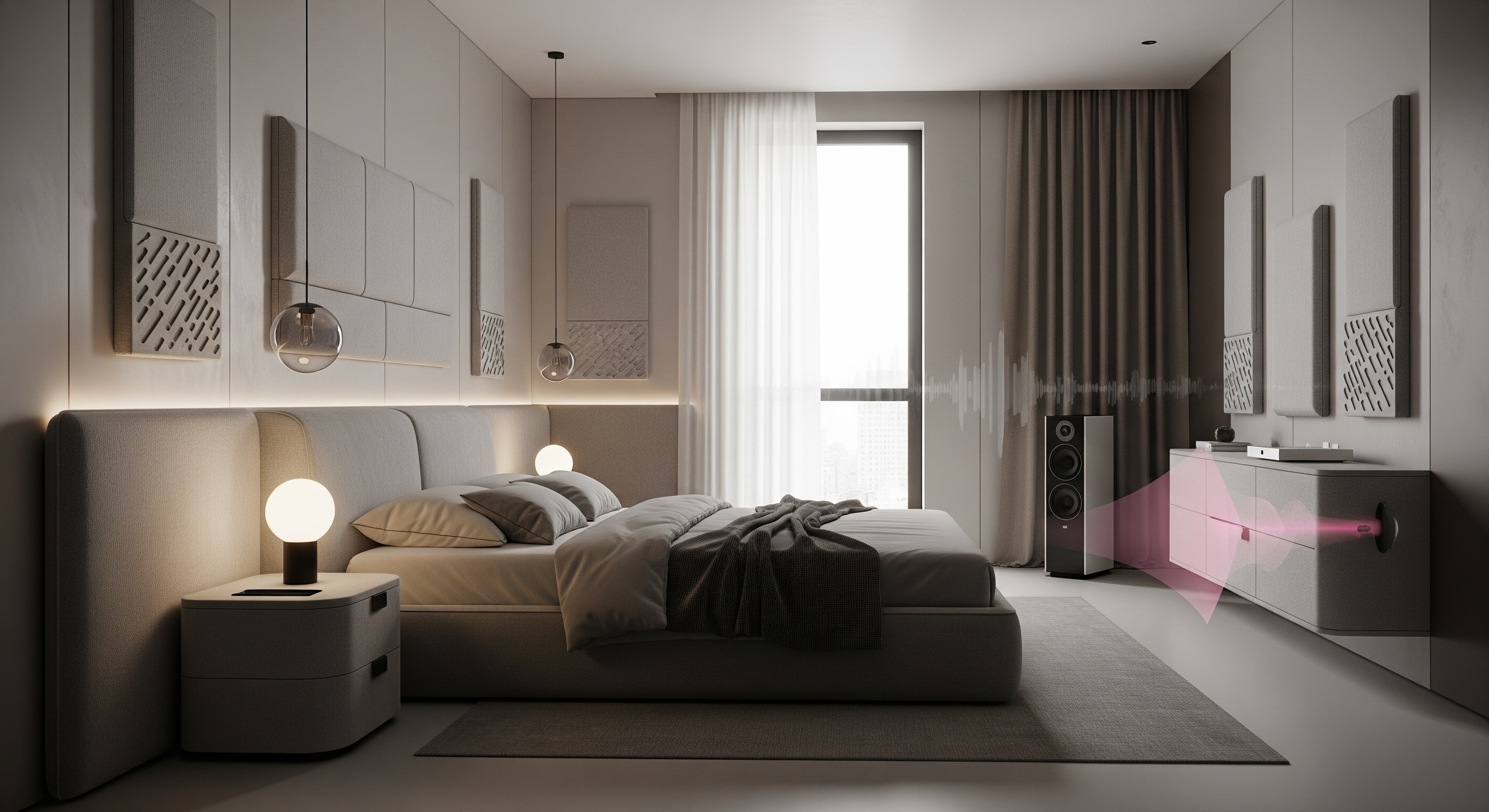 Премиальные решения предполагают использование акустических панелей, замаскированных под декор. Бренды вроде Kvadrat Acoustics или Bang & Olufsen предлагают текстильные панели, которые гасят реверберацию (эхо) внутри комнаты, делая звук «сухим» и интимным. Мягкое изголовье кровати, заходящее на стены, — это не только тренд, но и звуковая ловушка.