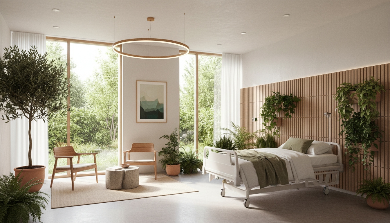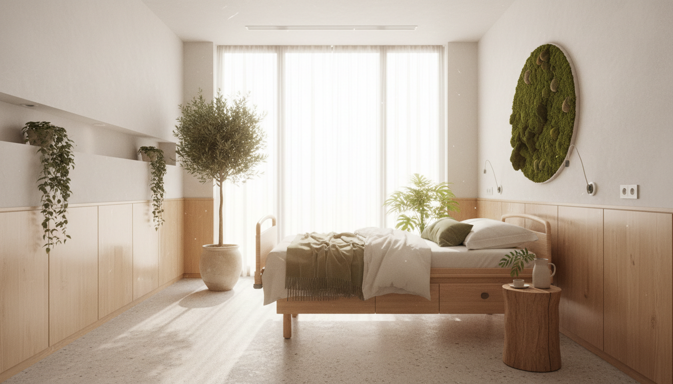 Систематический обзор Frontiers (2024) суммирует работы за последние 13 лет и приходит к однозначному выводу: биофильный дизайн в больницах оказывает прямое воздействие на сокращение времени госпитализации, снижение уровня боли и стресса у персонала и пациентов. Авторы отмечают, что эффекты наиболее выражены при комплексном подходе: зеленые зоны, доступ к виду на природу и оптимизированный свет.