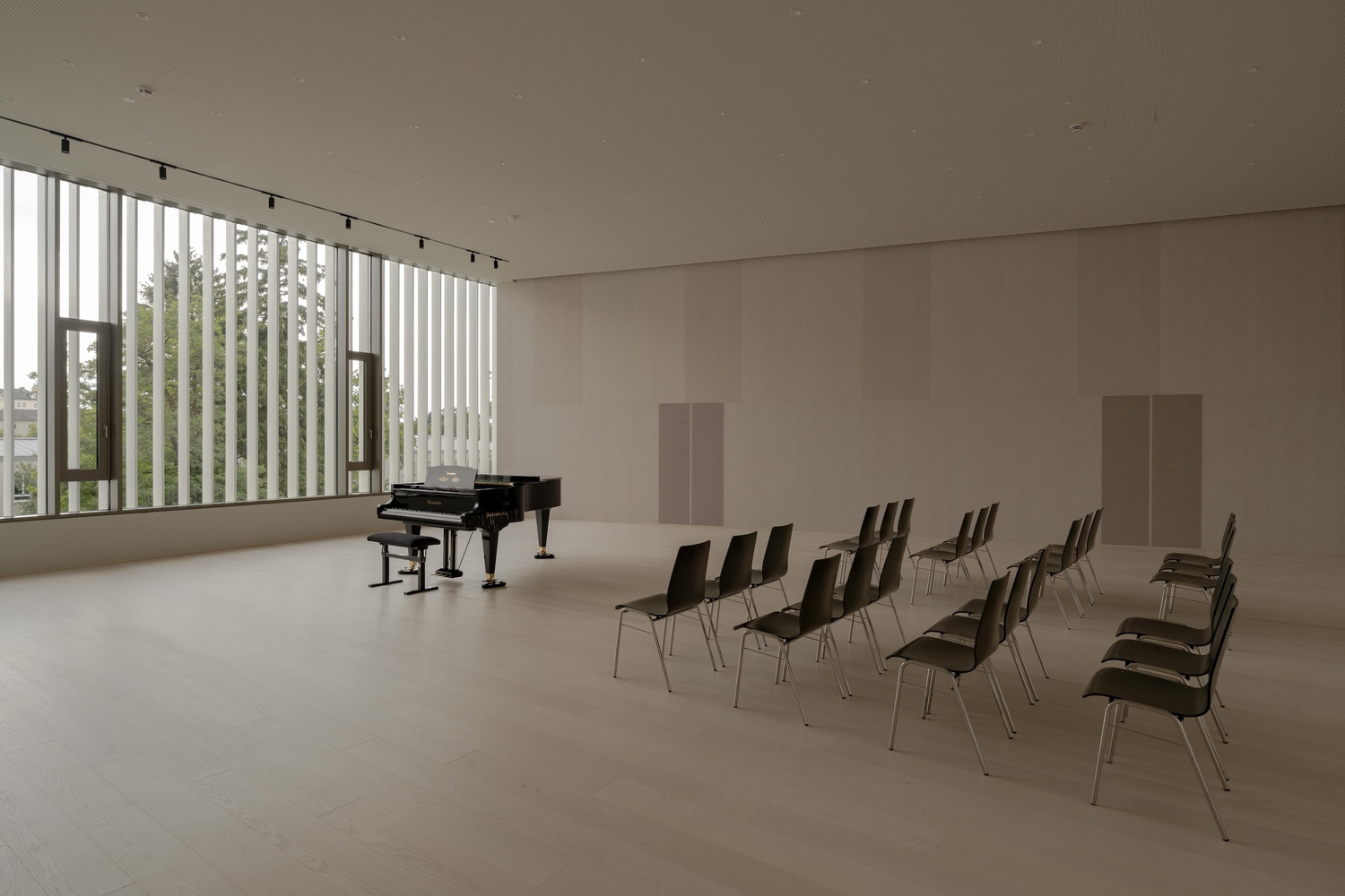 Этот дизайн учитывает особые требования университета искусств, специализирующегося на музыке: отдельные кабинеты нуждаются в дневном свете и вентиляции, концертные залы - в большом остеклении, а студии - в темноте и тишине. В больших репетиционных залах фиксированные ламели обеспечивают защиту от солнца. Для учебных аудиторий был разработан единый формат окон со встроенной защитой от солнца и бликов. Входная зона и соединение между двумя зданиями щедро застеклены.