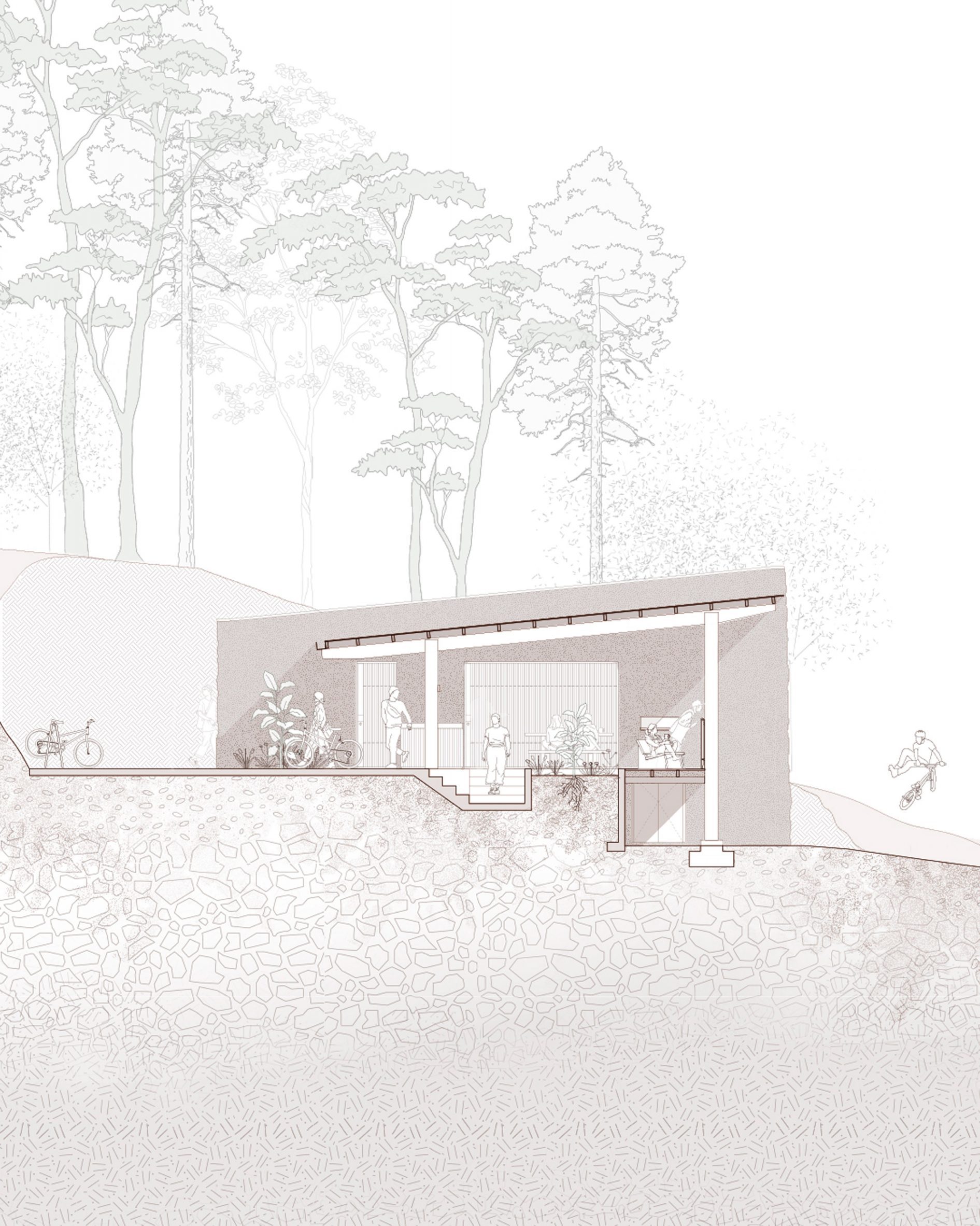 Бетонные блоки по обеим сторонам — в одном из них находится зона ресепшена и веломагазин, а в другом — небольшое кафе-ресторан — обрамляют центральную зону отдыха со столиками для пикника, клумбами и утопленными в землю местами для сидения. Пигмент землистого оттенка на бетоне подчёркивает связь убежища с землёй, а проёмы с металлическими рамами наполняют сдержанные внутренние пространства естественным светом.