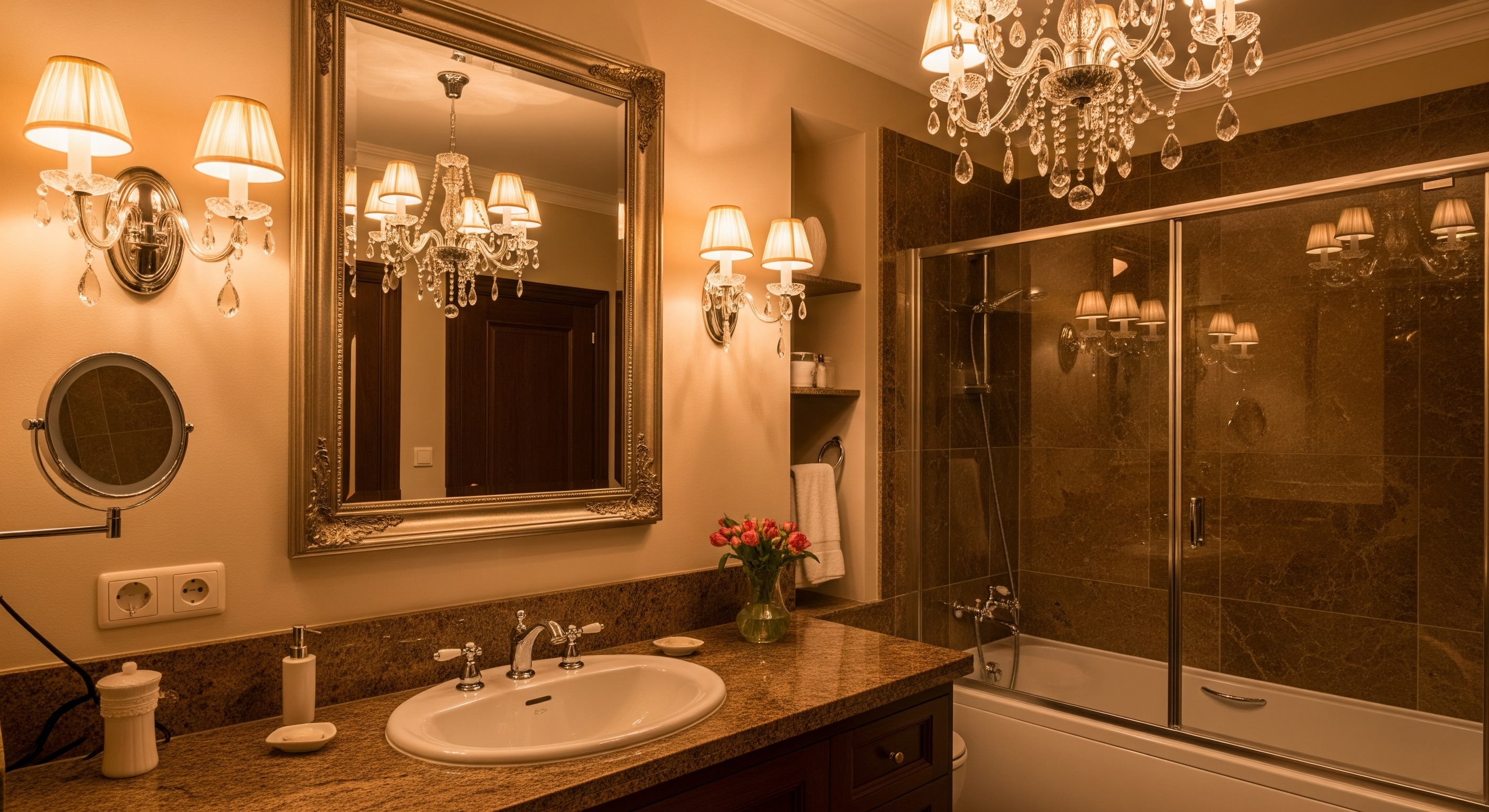 Первый шаг к ванной-гостиной — безжалостное истребление холодных спотов на потолке. Им на смену приходят хрустальные люстры, винтажные бра с тканевыми абажурами и акцентная подсветка. Свет должен быть мягким, янтарным, льстящим вашему отражению. Его задача — не «освещать», а создавать сцену для вашего вечера.