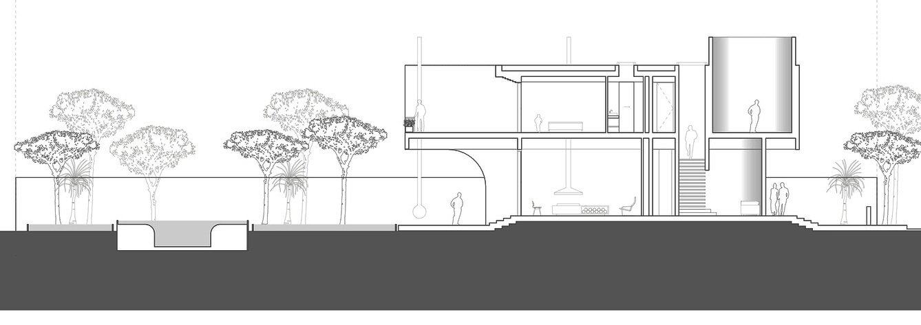 Наверху находится пространство для медитации, открытое небу, соединяющее дом с небесным миром. Это место уединения и самоанализа, тихая пауза, когда свет становится духовным. Пышная растительность вокруг создаёт уютную зелёную обстановку, органичную колыбель, которая смягчает геометрию архитектуры и завершает диалог между природой, структурой и человеческим телом.