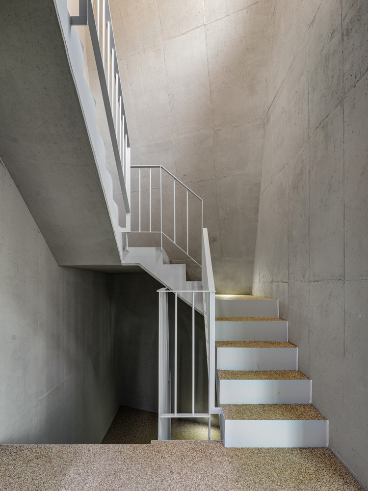 Северная сторона участка граничит с прилегающим участком на возвышенности, что накладывает ограничение по высоте из-за правил дневного света, направленных на север. Чтобы сделать необходимый откос, который не виден спереди, заметным с главной дороги, архитекторы применили конструкцию, при которой массы постепенно выступают вперёд от 3-го этажа вверх. Эта композиция была задумана для того, чтобы создать ощущение напряженности и динамизма на фасаде здания, если смотреть с обочины дороги.