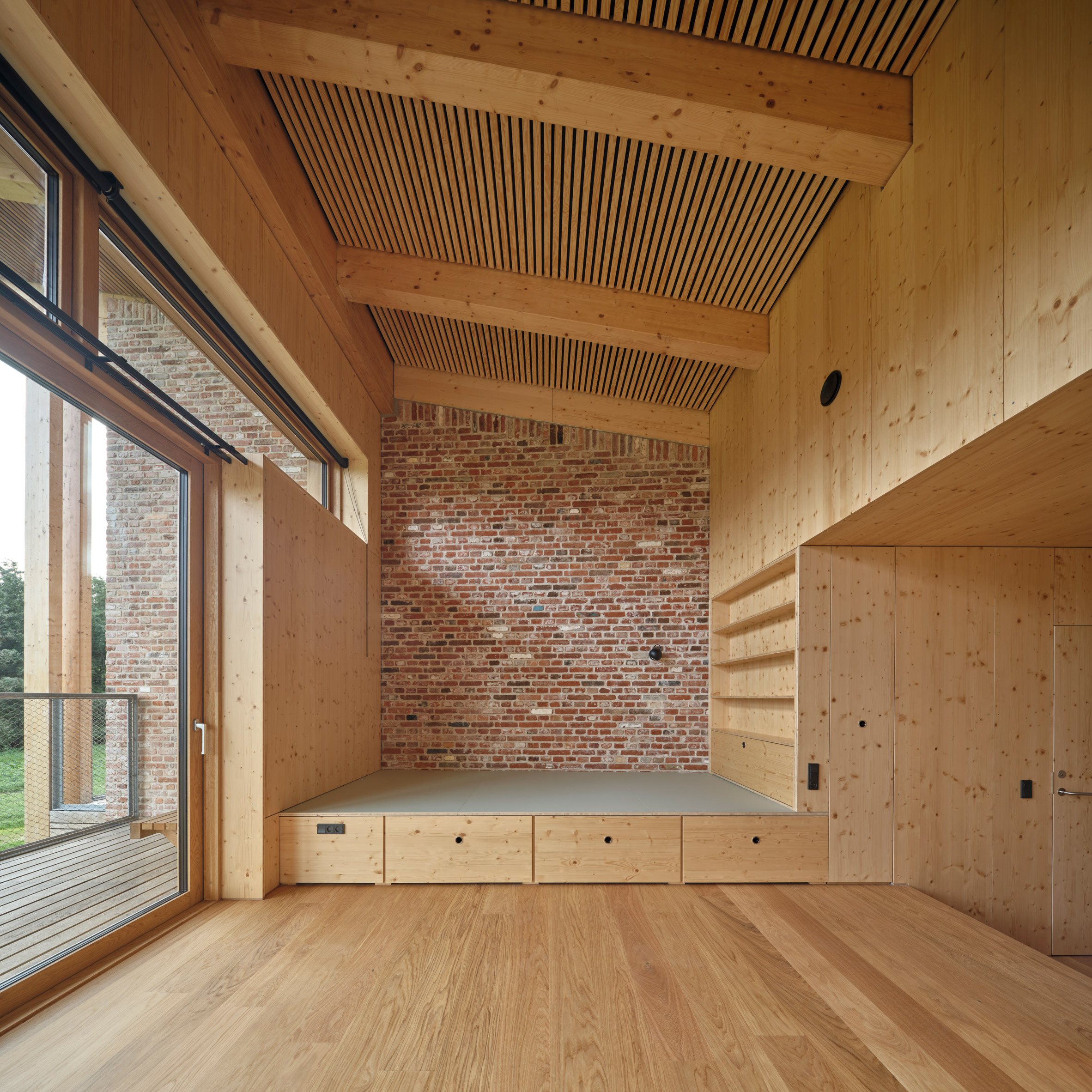 Эта палитра прослеживается и в интерьерах The Crafts College, где в общих зонах оставлена необработанная кирпичная кладка, а спальни обшиты деревянными панелями, за которыми скрываются вместительные встроенные шкафы. «Стремясь превратить здание в живой учебник, мы выбрали материалы, которые можно потрогать и которые легко использовать, чтобы ученики могли понять принципы тектоники и ремесленные методы», - объяснил Пайлеманд.