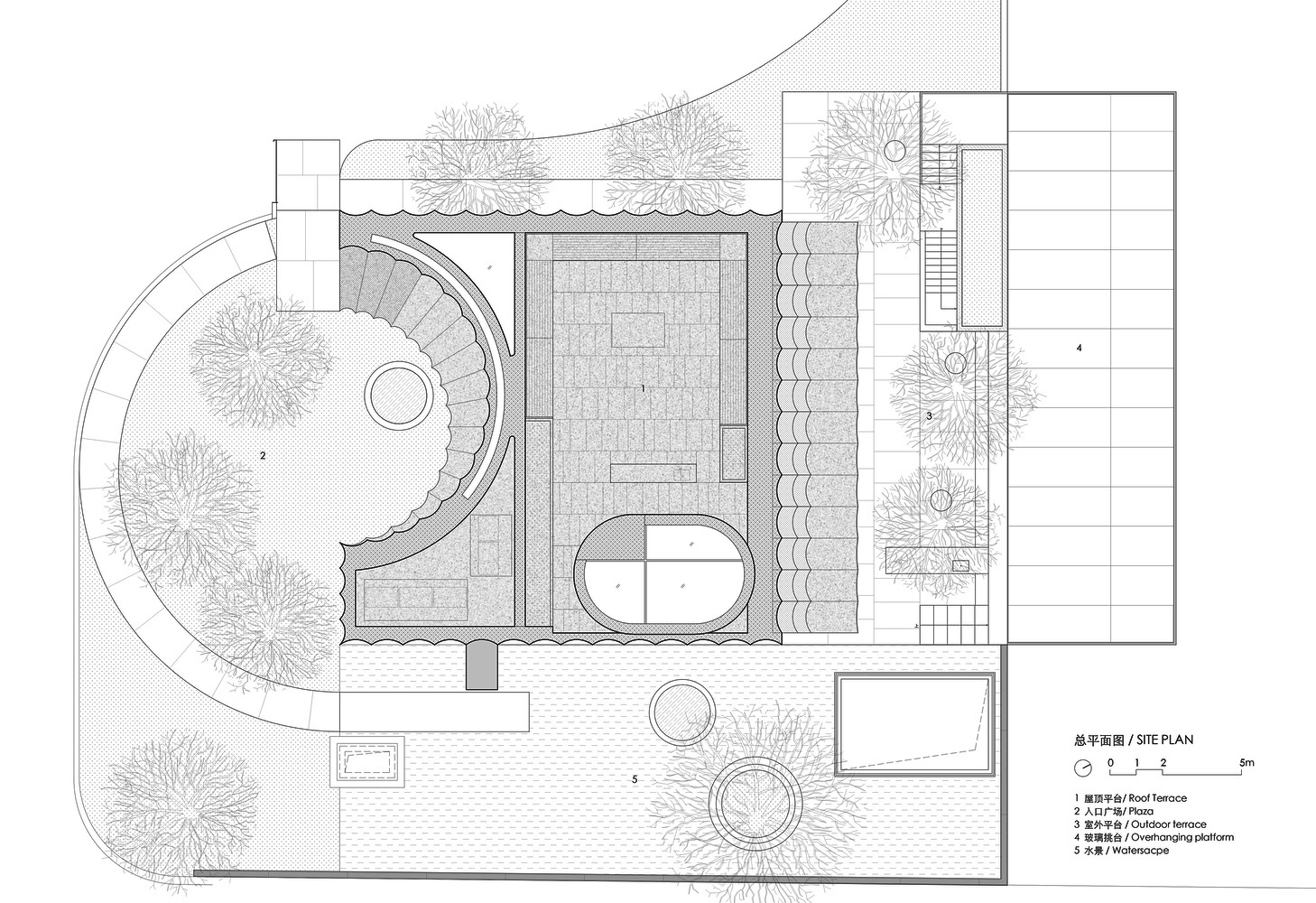 Первый этаж выходит окнами на север, соединяясь с консольной платформой, что стирает границы между зданием и городом. На углу здания все три надземных уровня соединены вертикальным проёмом, который не только устраняет неловкость оригинального остроконечного пространства, но и создаёт духовную атмосферу, поскольку свет нисходит сверху.