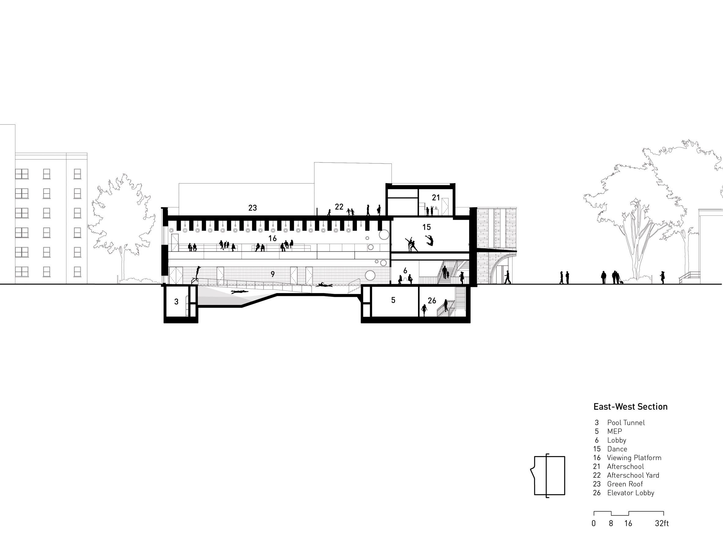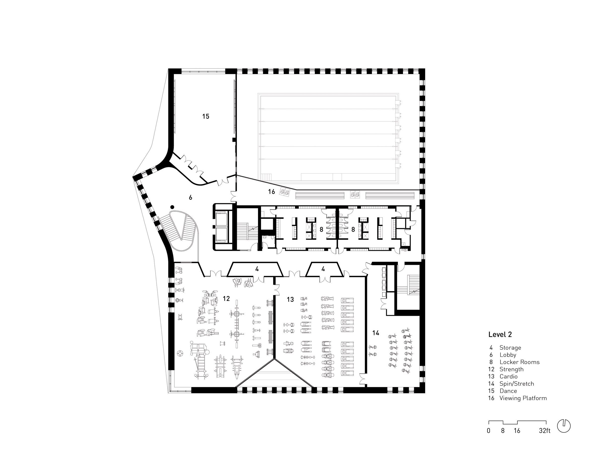 Большие арочные окна, врезанные в плавно изогнутый кирпичный фасад, подчёркивают гостеприимство здания и наполняют его естественным светом и видами. Внутри здания расположены двухуровневый спортивный зал и бассейн по обеим сторонам здания. Между двумя большими помещениями расположены небольшие пространства для кабинетов персонала, раздевалок, танцевальных студий, силовых и кардиотренировочных залов.