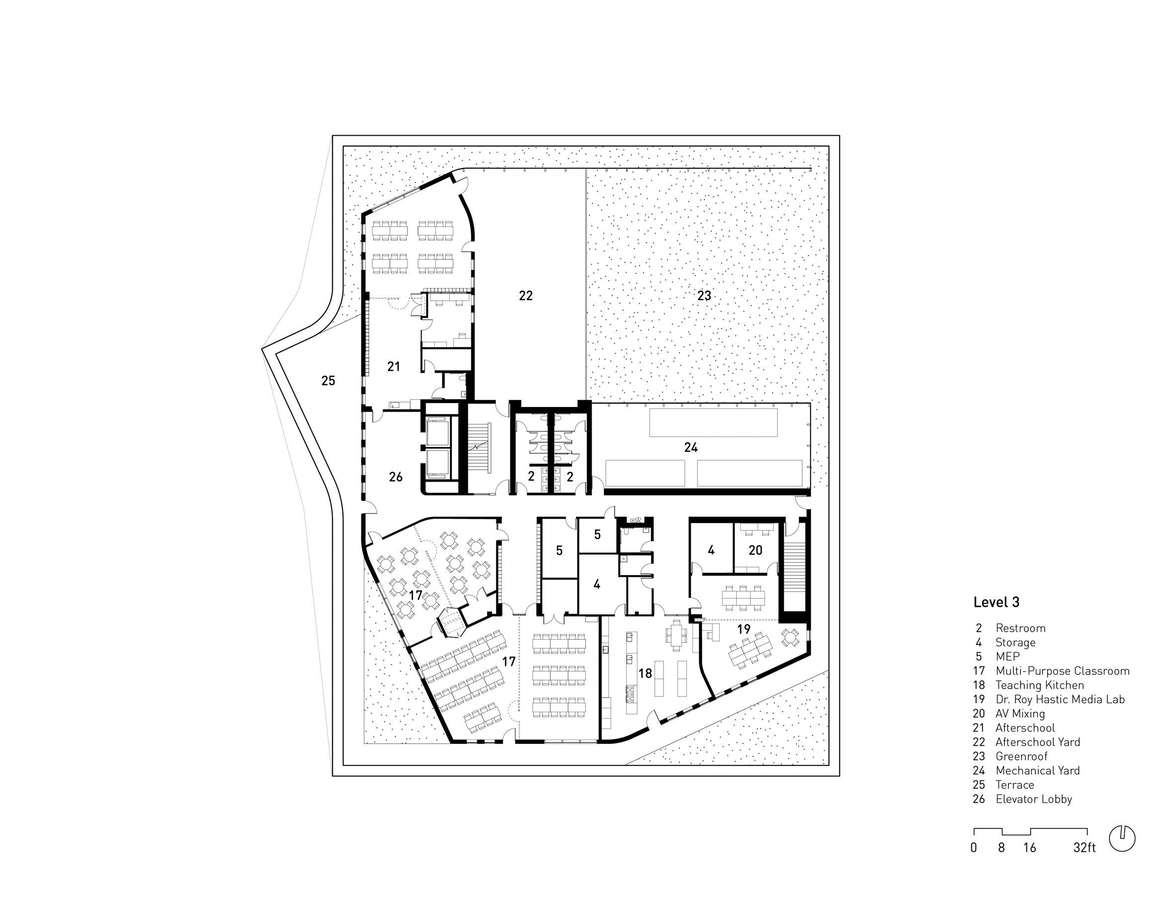 Вырезы, смотровые площадки и внутренние окна обеспечивают обзор всего внутреннего пространства здания. В вестибюле находится ярко-оранжевая парадная лестница, а среди других элементов интерьера — клееные деревянные балки над зоной бассейна, изделия из дерева ручной работы и произведения искусства художницы Ванессы Герман, в том числе серия бюстов.