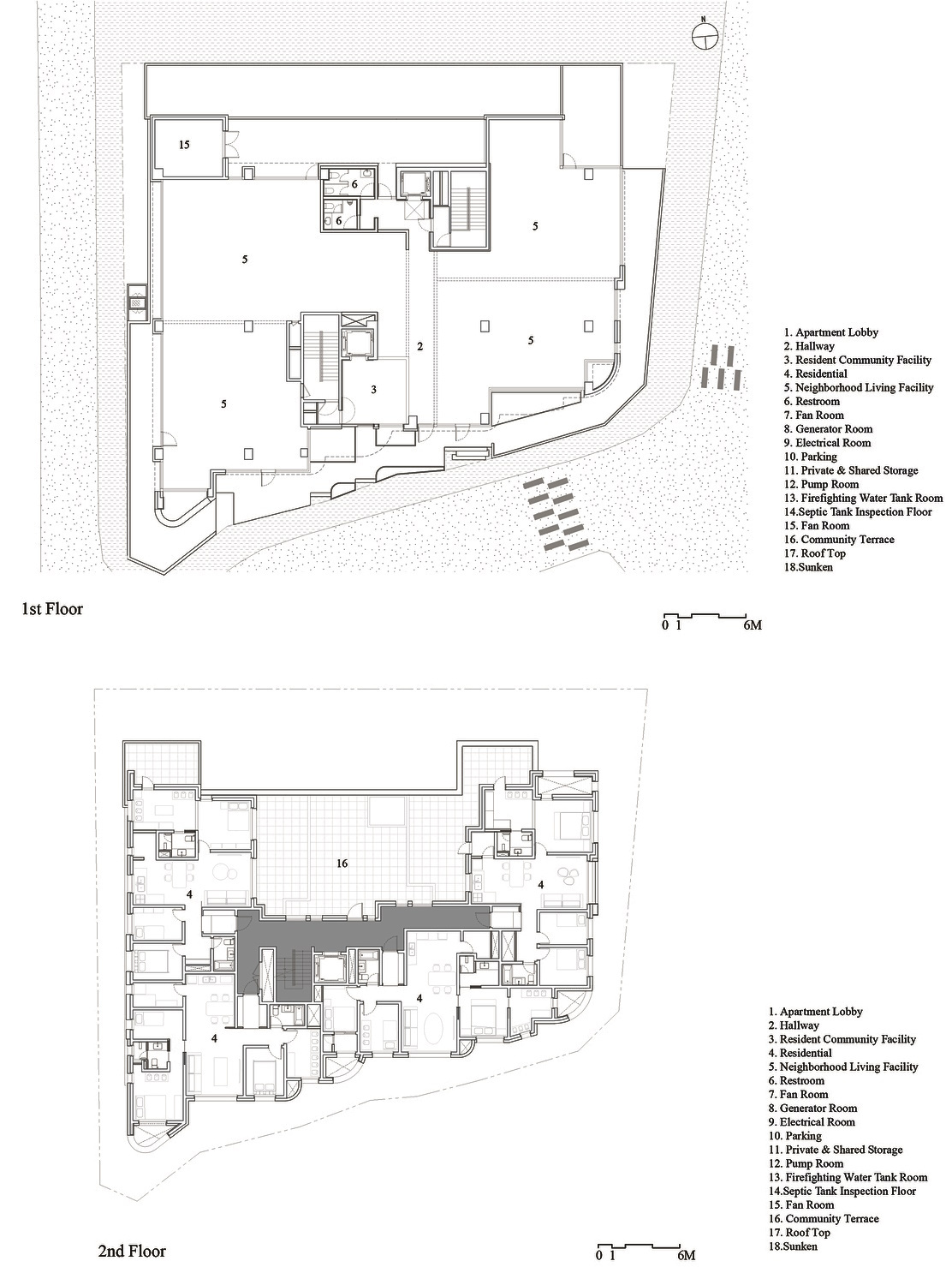 Каменные и плиточные поверхности, теплые деревянные полы и мягкая текстурированная отделка стен объединяют частные резиденции с коридорами, лестницами и общими пространствами комплекса, усиливая ощущение целостности на всех уровнях. Материалы были выбраны не только из-за их визуального спокойствия, но и из-за их физической теплоты, привлекательного прикосновения и подчеркивающего присутствие. Большие проёмы соединяют интерьер с окружающим ландшафтом, так что даже в помещении чувствуешь себя в ритме света и текстуры природы.