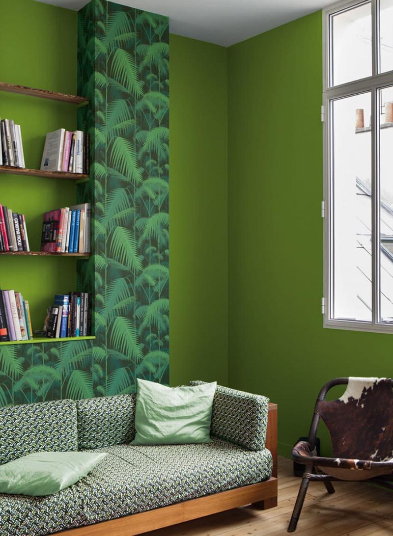 Но двухцветные обои не обязательно должны быть контрастирующих цветов, они могут сочетать два родственных оттенка. Такие обои будут смотреться более уравновешенно, но все же необычно.