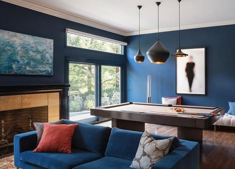 Синий - это новый черный. Если гостиная в черном цвете для вас слишком дерзкая идея - выполните ее в оттенке Riverside (прибрежная полоса). Результат получится не менее интересный!