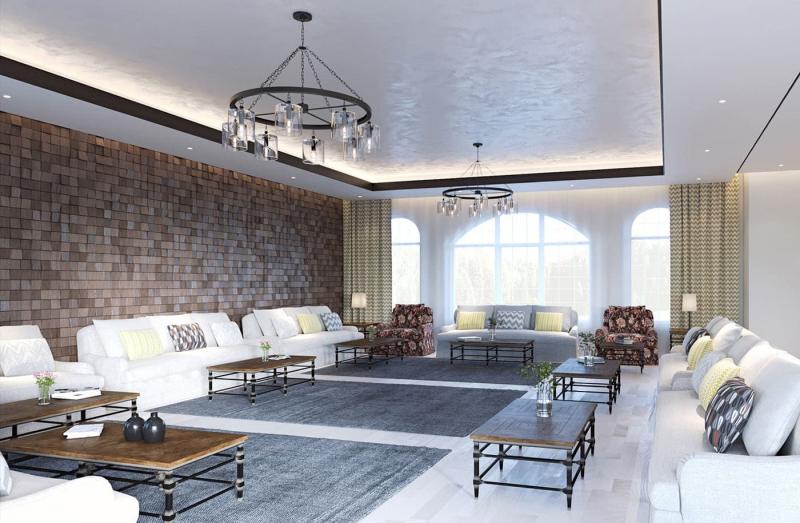 Уделите особое внимание освещению: так как площадь комнаты большая, одной потолочной люстры будет недостаточно, обязательно потребуются локальное освещение в разных частях гостиной.