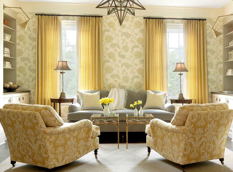 Занавески с узорами станут стильным и броским аксессуаром в вашей гостиной. Но такие шторы обязательно должны быть без ламбрекенов!