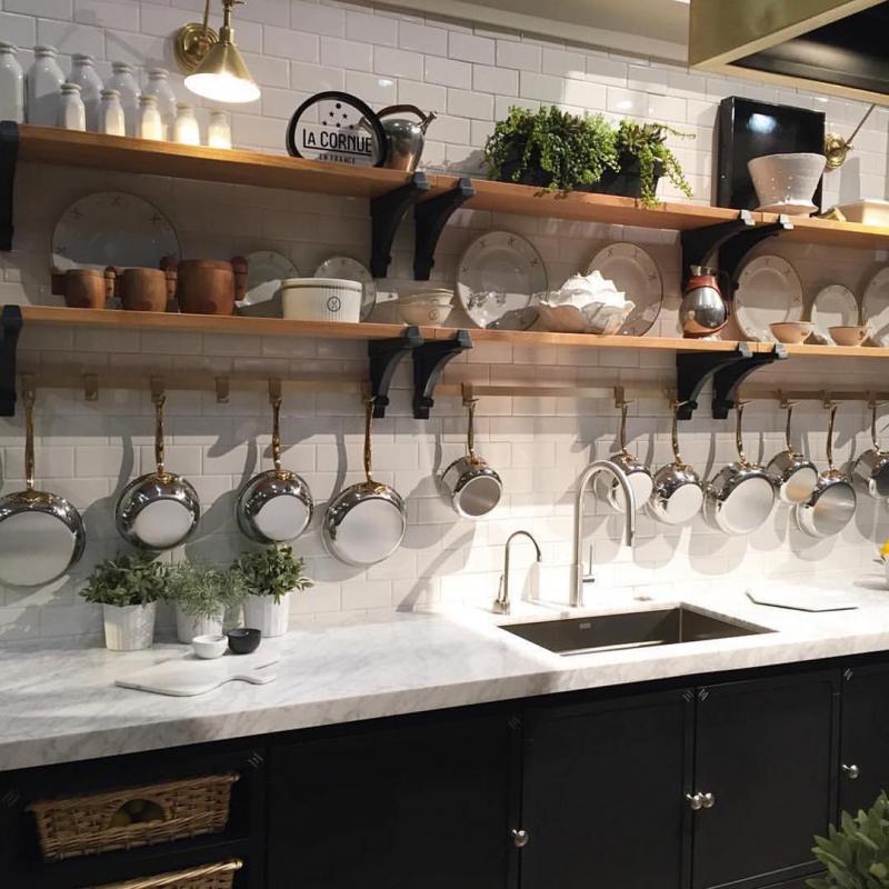 Тенденция отказа от верхней линии кухонного гарнитура в пользу открытых полок для хранения посуды продолжится и в 2019 году.