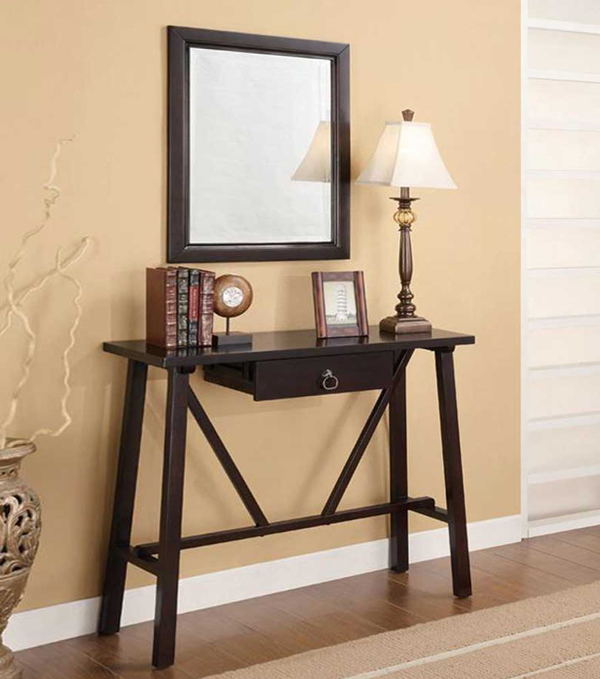 Интересным решением станет использование в интерьере прихожей невысокого комода, особенно в сочетании с зеркалом необычной формы.