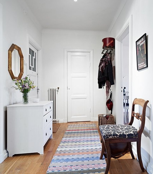 Небольшой ковёр интересного цвета – ваш шанс создать ещё один сочный акцент в вашем интерьере, а ковёр с поперечными полосами легко справится с ролью «расширителя» пространства в узком коридоре.