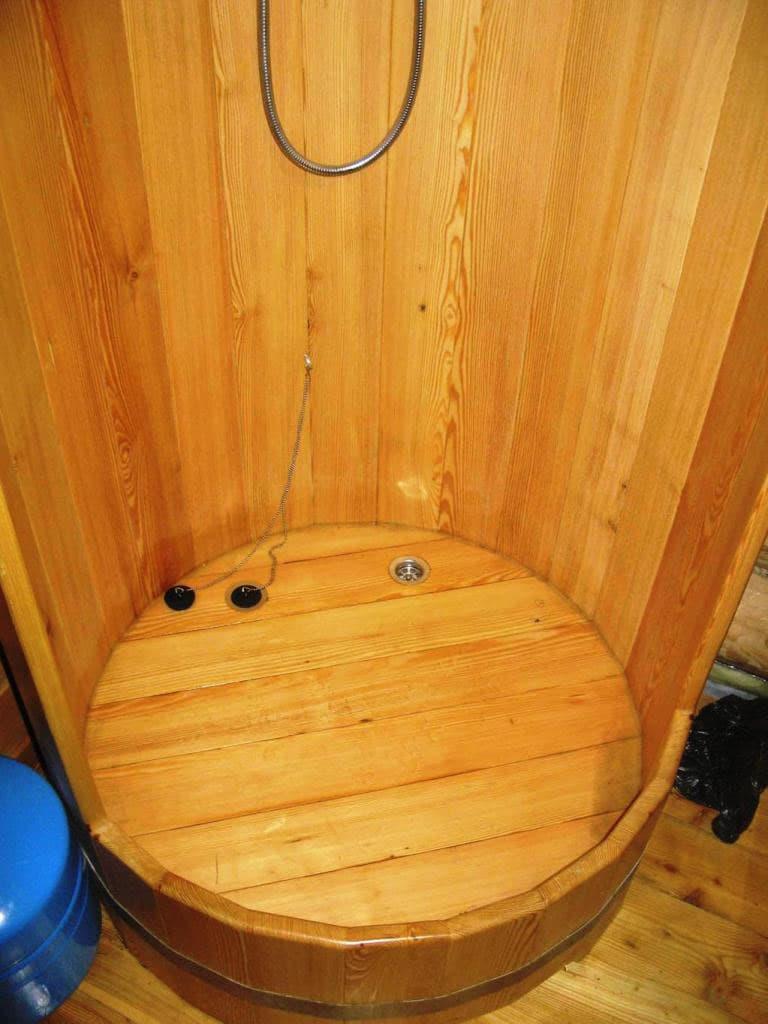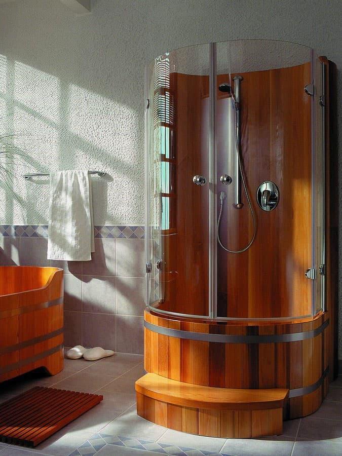 Модная тенденция использовать камень или дерево коснулась также и душевых кабин. Каменным или деревянным может быть только поддон, а может быть и вся кабинка, включая стены и крышу.