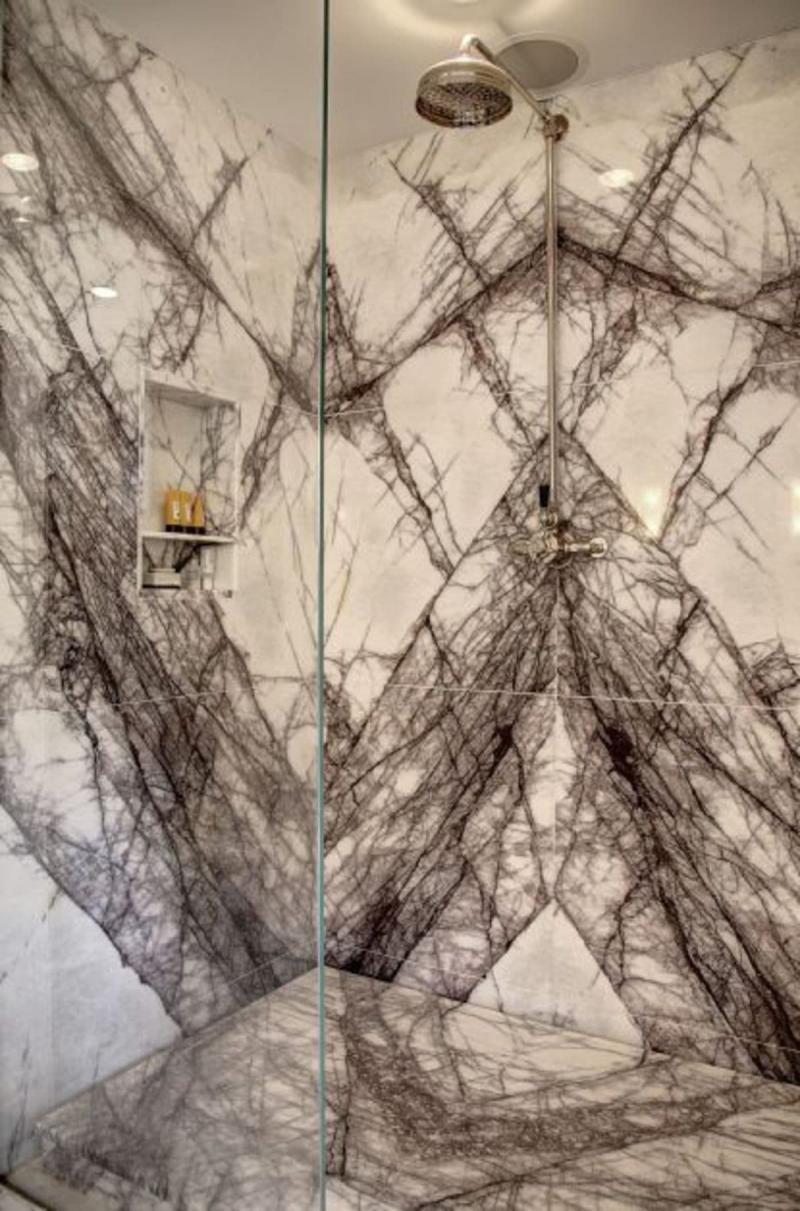 Из всех разновидностей мрамора, самый модный в 2019 году - серый. Его, кстати, можно использовать не только для стен, но и для пола и даже умывальника и столешницы.