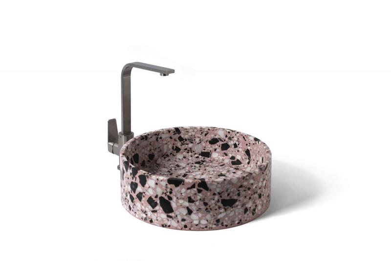 Между монотонным бетоном и дорогостоящим мрамором затесался терраццо. Интереснее, чем первый, и в разы бюджетнее, чем второй, он весьма необычно смотрится в интерьере ванной комнаты.