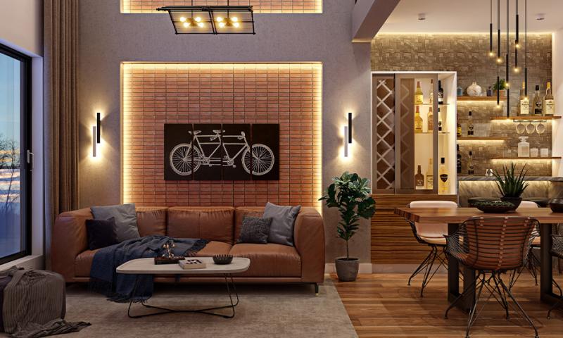 Ничто не понравится вам больше, чем этот уютный дизайн интерьера гостиной, создающий ощущение личного кабинета. Кирпичные стены, секционный диван с поднимающимся журнальным столиком и высокие комнатные растения — все, что вам нужно, чтобы завершить образ мечтательной гостиной в деревенском стиле в вашей небольшой городской квартире.