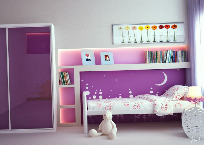 Интересно смотрится контраст розовых и сиреневых оттенков с бежевым, белым цветом, нежными оттенками зеленого и бирюзового, насыщенным шоколадным цветом. Разнообразить комнату можно яркими элементами в тон стен – мебелью, картинами, светильниками, игрушками сливового, неоново- и ярко-розового, малинового, цвета фуксия.