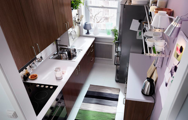 В кухне не более шести квадратных метров лучше не загромождать пространство шкафами для техники. Также стоит отказаться от шкафов-колон в пользу навесных шкафчиков и пары тумб в нижней линии.