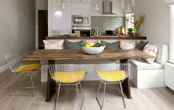 - Размещение гостей за кухонным столом на диване существенно ограничивает их свободу передвижения – чтобы выйти из-за стола, придется потревожить рядом сидящих.