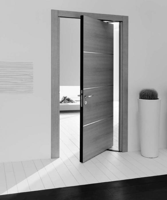 Подобная конструкция и тип открытия в настоящее время применяется повсеместно: как в качестве межкомнатных, так и в качестве входных дверей.